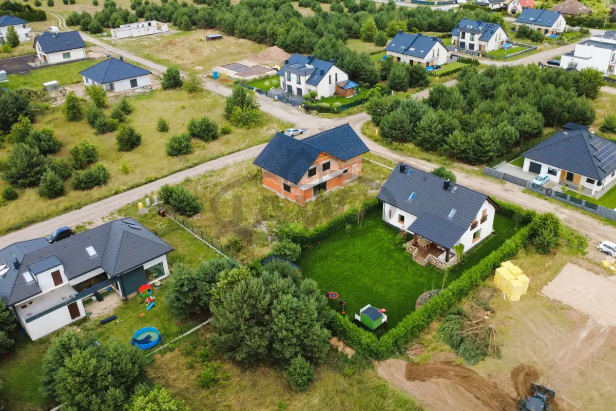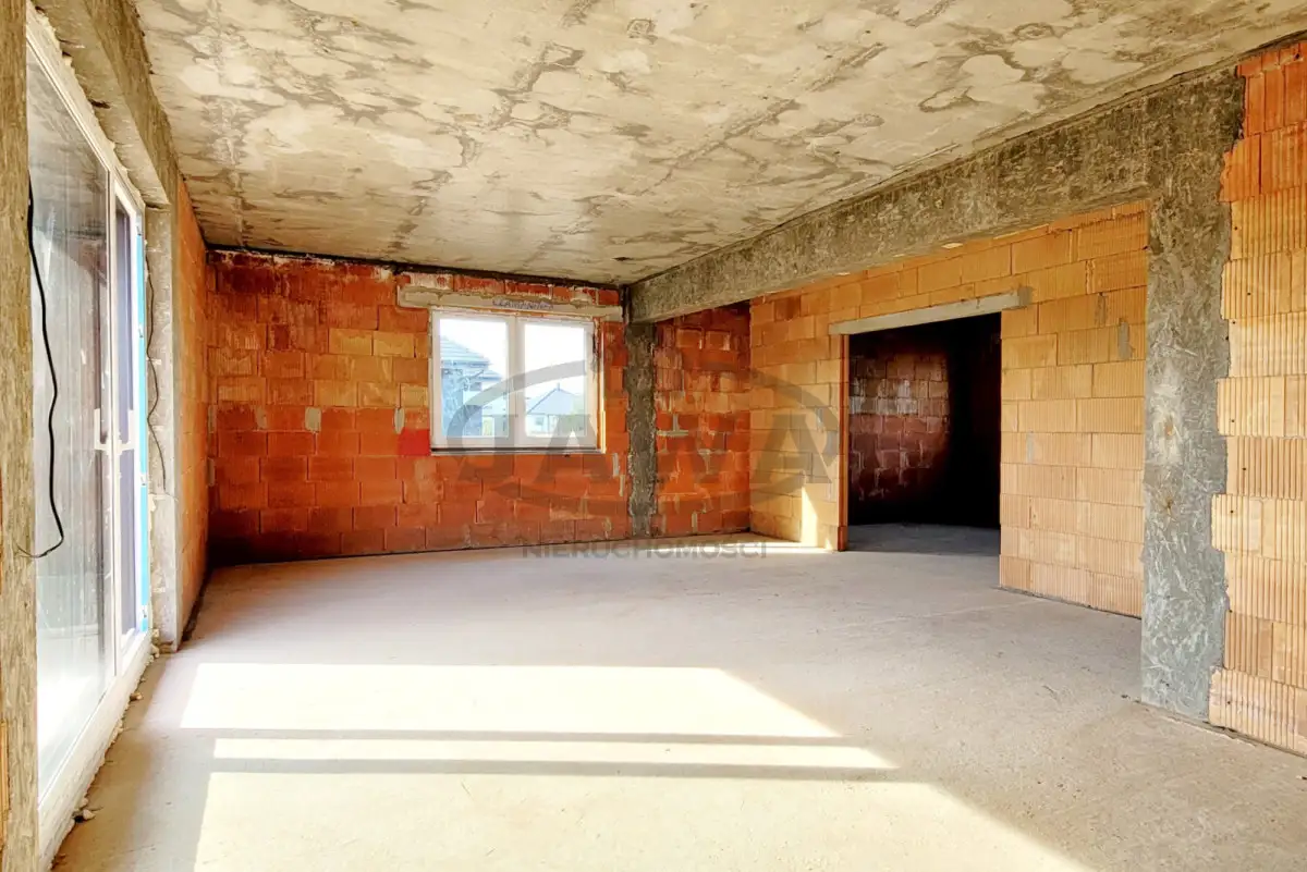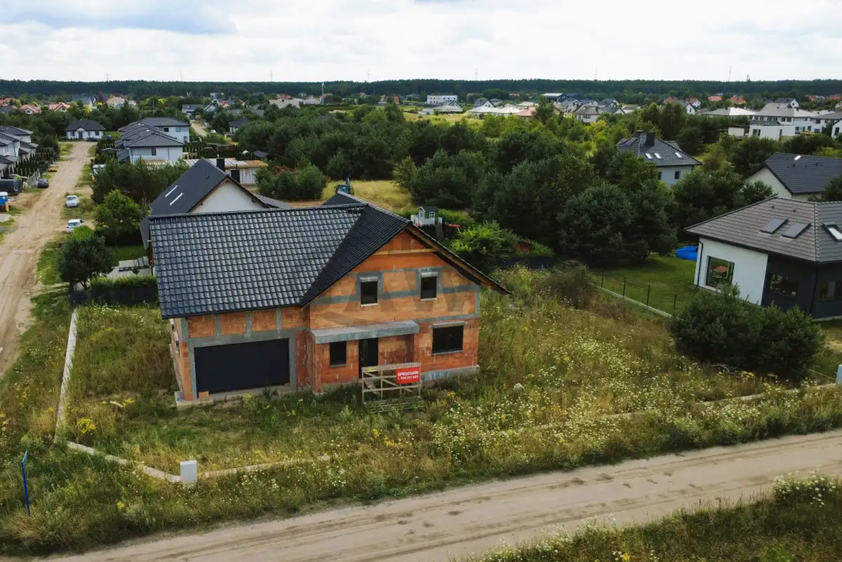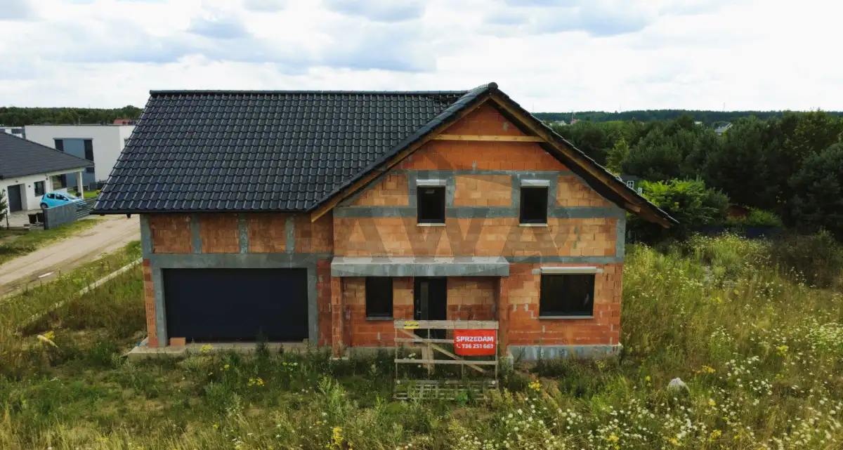 Dom jednorodzinny w stanie surowym zamkniętym z poddaszem użytkowym. Jest to budynek wolnostojący o powierzchni użytkowej ponad 200 metrów kwadratowych na działce 1021 m², z wbudowanym dwustanowiskowym garażem, z dachem krytym dachówką ceramiczną. Działka od południa ogrodzona siatką systemową, jest też wylany fundament pod ogrodzenie murowane. Do domu doprowadzone woda i kanalizacja. Skrzynka z prądem przy działce.