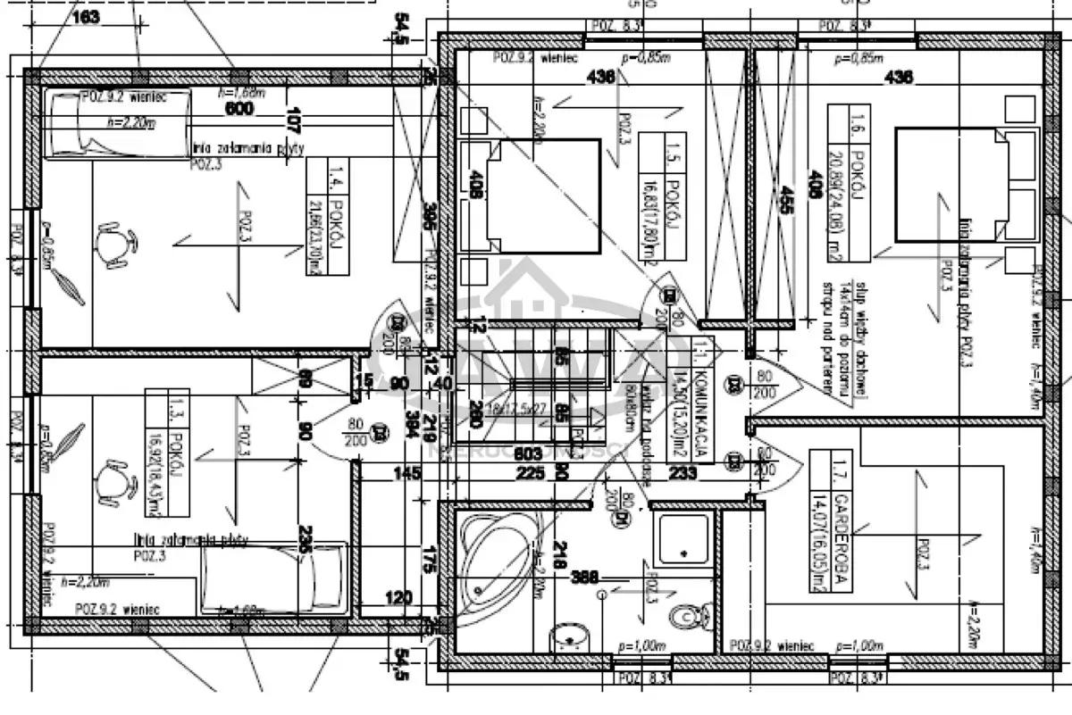 Na piętrze budynku są: łazienka oraz 4 sypialnie i ogromna garderoba.