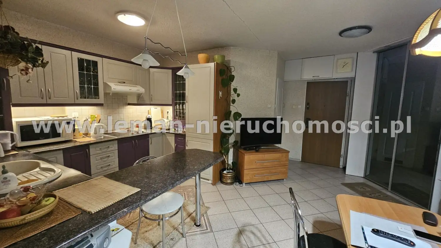otwarty pokój dzienny oddzielony od kuchni tylko barem śniadaniowym (w zabudowie zastosowano płytę elektryczną - nie ma gazu)