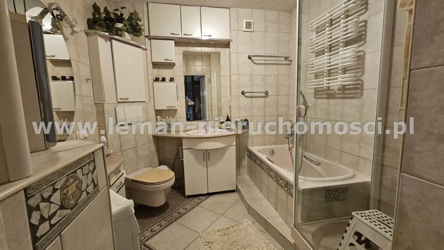 przestronna łazienka z wanną, kabiną prysznicową, toaletką, umywalką, pralką i WC