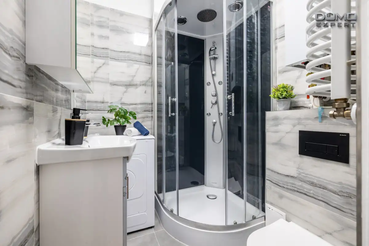 - łazienka z prysznicem i pralką po generalnym remoncie,