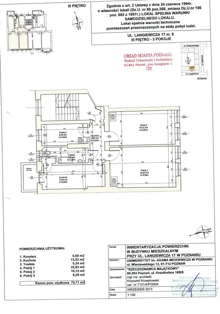 - lokal mieszkalny nr 8 w budynku przy ul. Langiewicza 17, usytuowany na III piętrze budynku mieszkalnego wielorodzinnego o łącznej powierzchni użytkowej 75,71 m², składający się z: 3 pokoi, kuchni, toalety i korytarza, dla którego Sąd Rejonowy Poznań - Stare Miasto w Poznaniu prowadzi księgę wieczystą nr KW PO2P/00301714/9, a także udział w wysokości 7571/468655 w częściach wspólnych budynku oraz w prawie własności gruntu, oznaczonego w ewidencji gruntów jako działka nr 65, ark. mapy 15, obręb Wilda, o powierzchni 0,1095 ha oraz działka nr 74, ark. mapy 15, obręb Wilda, o powierzchni 0,1102 ha, dla których prowadzona jest księga wieczysta nr KW PO2P/00101206/3. Dział III (obciążenia i ograniczenia) i Dział IV (hipoteki) księgi wieczystej nr PO2P/00301714/9, nie zawiera wpisów.