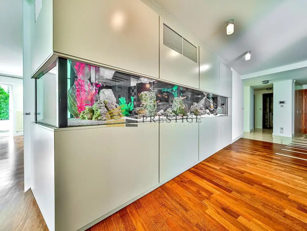 Upon entering, you are greeted by an impressive aquarium that invites guests inside. The living room, the heart of the apartment, boasts a home cinema and an elegant fireplace, creating a cozy and relaxing atmosphere. Large windows in the living room overlook the garden, adding charm to the interior and providing access to natural light. The adjacent kitchen captivates with solid granite countertops and complete equipment, with a practical pantry next door. Additionally, the apartment offers two dining areas - one formal, perfect for special occasions, and another for everyday use.