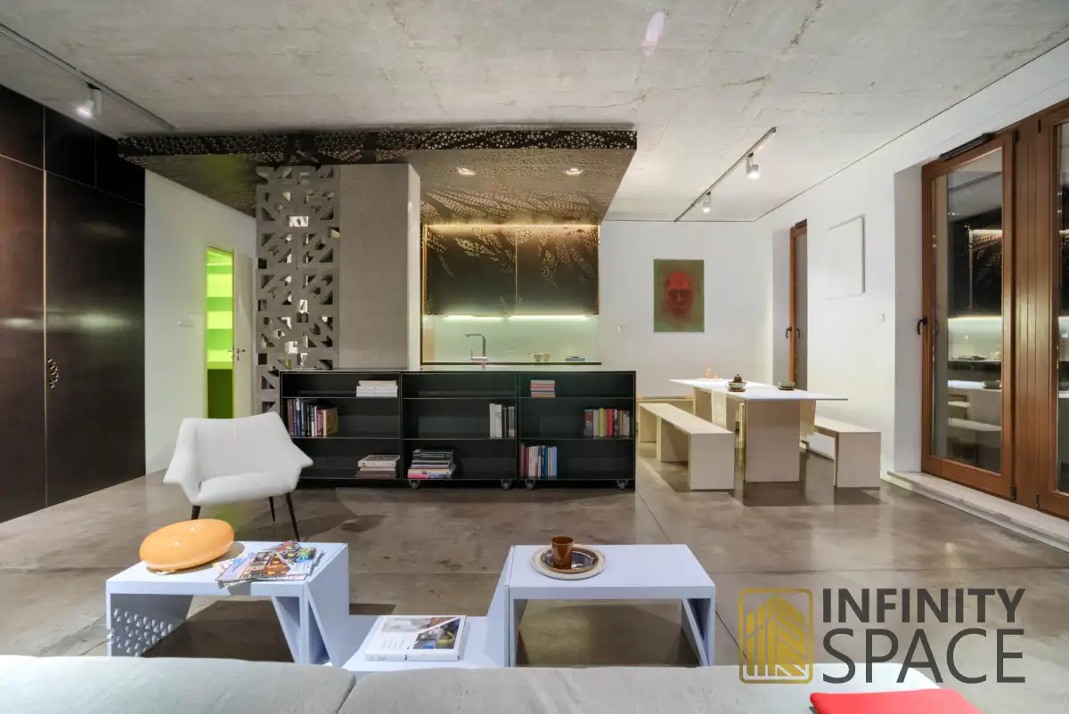 Multifunctionality applies not only to the space layout, but also to the furniture. Coffee tables can serve as bar stools, when bookshelves come out from under the kitchen island. Then the island turns into a center of social life.