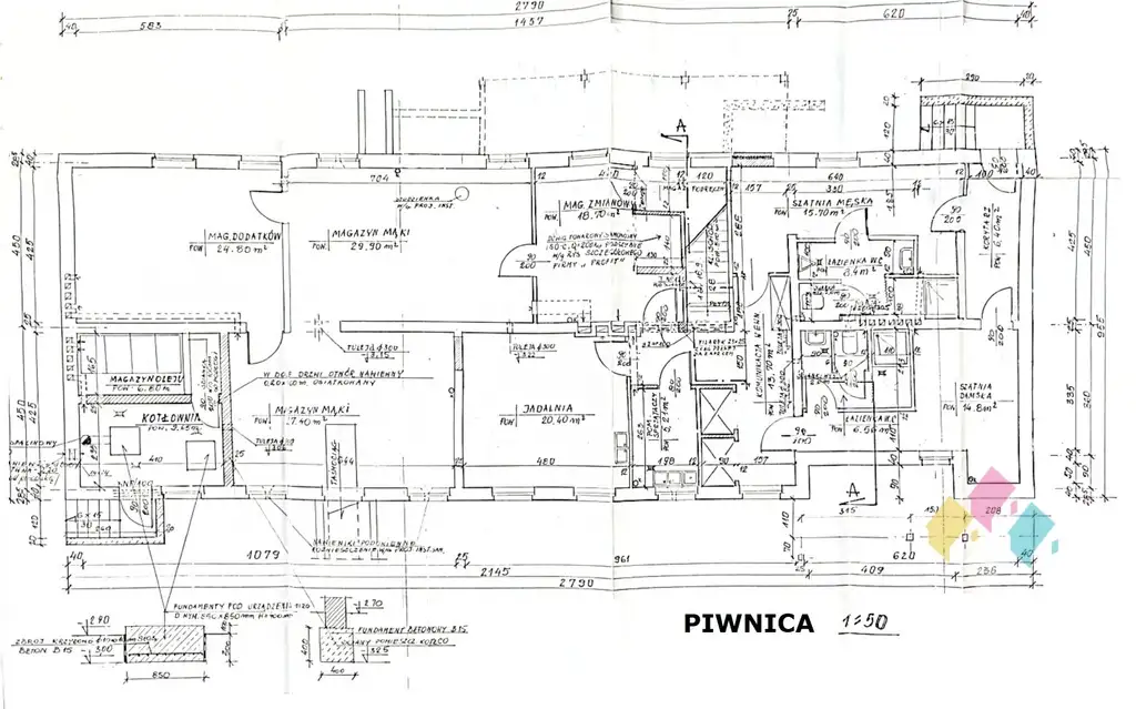 PIWNICA: 3 pomieszczenia magazynowe, (na zdjęciach stolarnia), 2 łazienki, 2 x szatnie, biuro, kuchnia, komunikacja, kotłownia. Wysokość 2,50 m.
