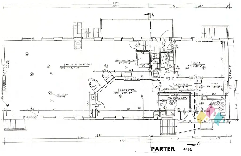 PARTER: hala produkcyjna 123 m², ekspedycja 29 m², sklep 26 m², zaplecze, biuro, zmywalnia, korytarz, WC. Wysokość 3,40 m,