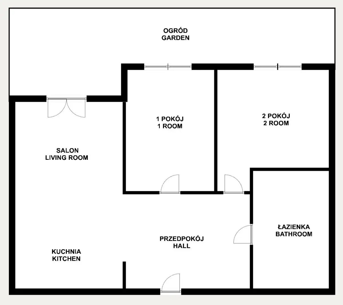 Pokoje: salon z aneksem kuchennym, dwa pokoje, łazienka z wanną, przedpokój, ogródek (20m²)