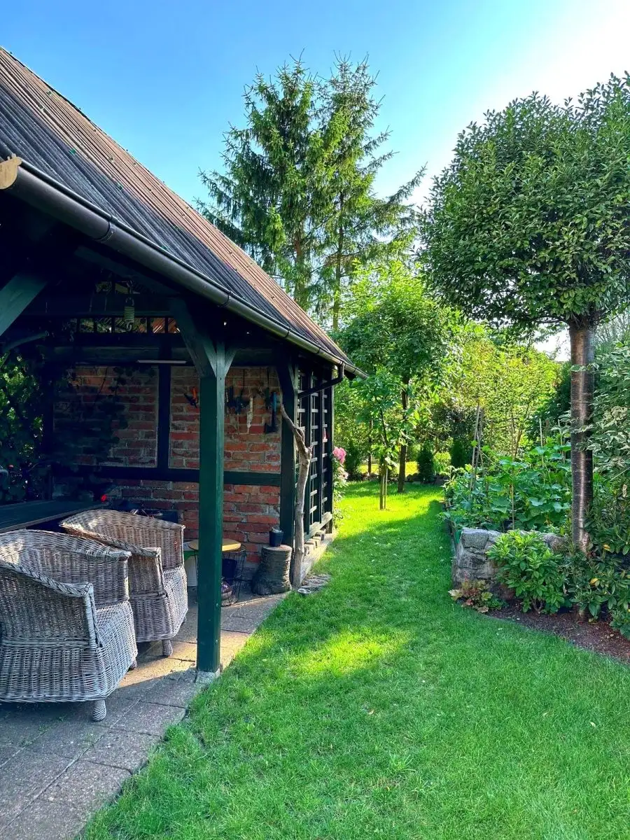 Do nieruchomości przynależy zadbany ogród o powierzchni 171 m², garaż w zabudowie szeregowej, przypisane miejsce postojowe oraz duża piwnica-
