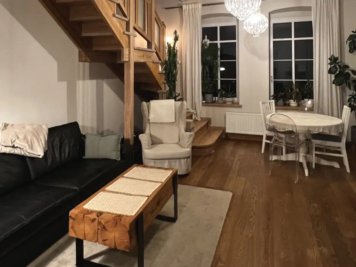 - Wnętrze łączy stylowe elementy z naturalnym drewnem i wyjątkową atmosferą starej kamienicy.