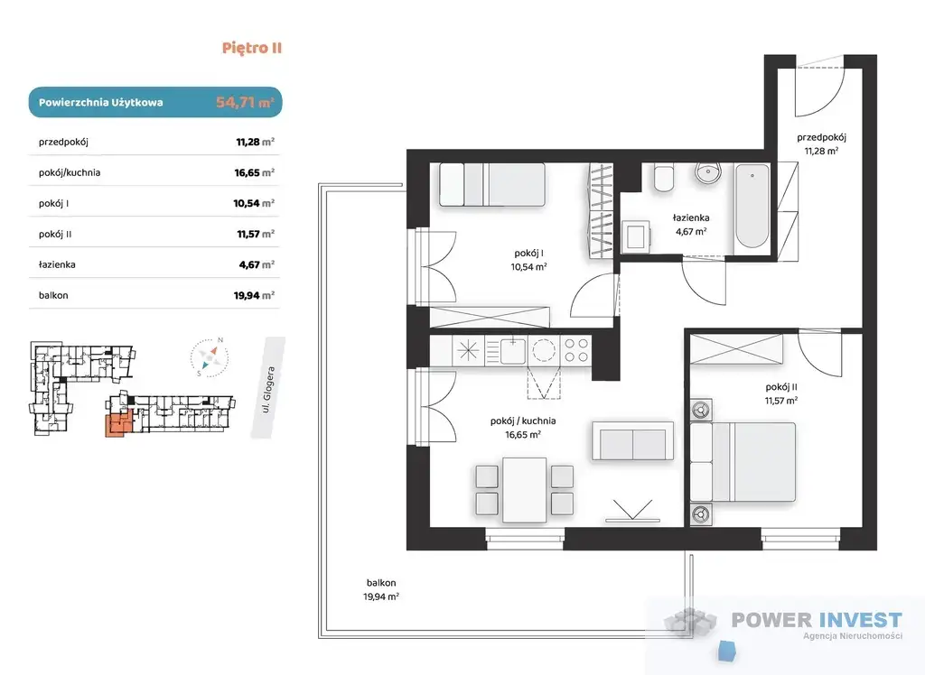 Mieszkanie znajduje się na 2 piętrze. Lokal ma powierzchnię 54,71 m² i składa się z: