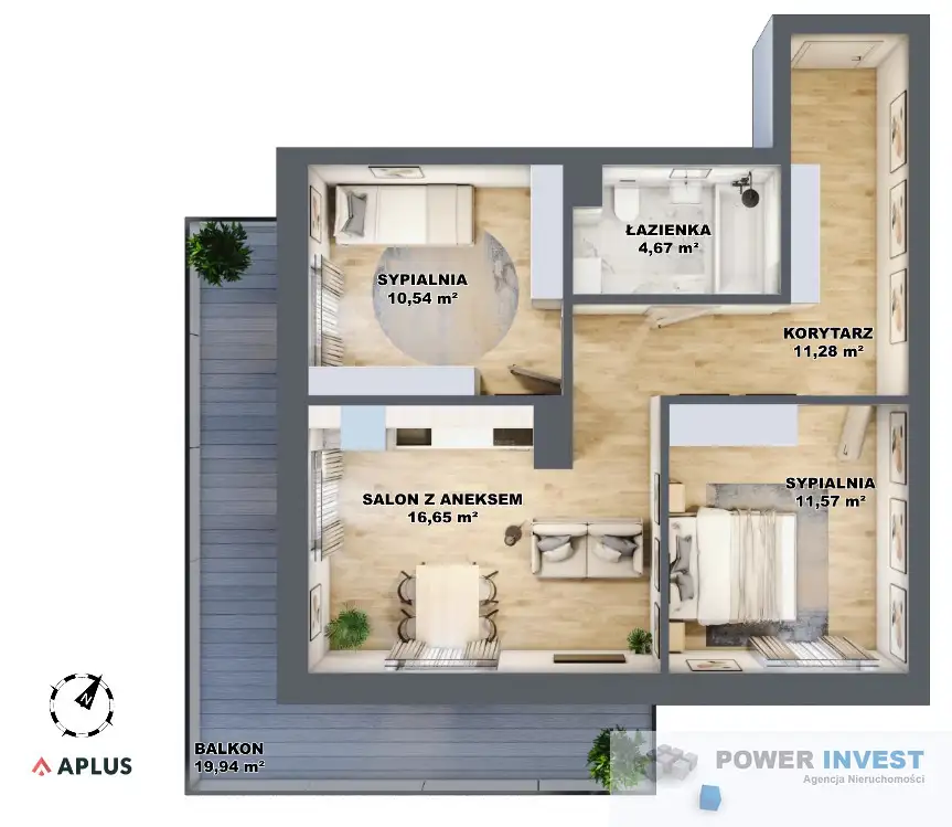 salonu z aneksem kuchennymsypialniłazienkiprzedpokojudużego narożnego balkonu