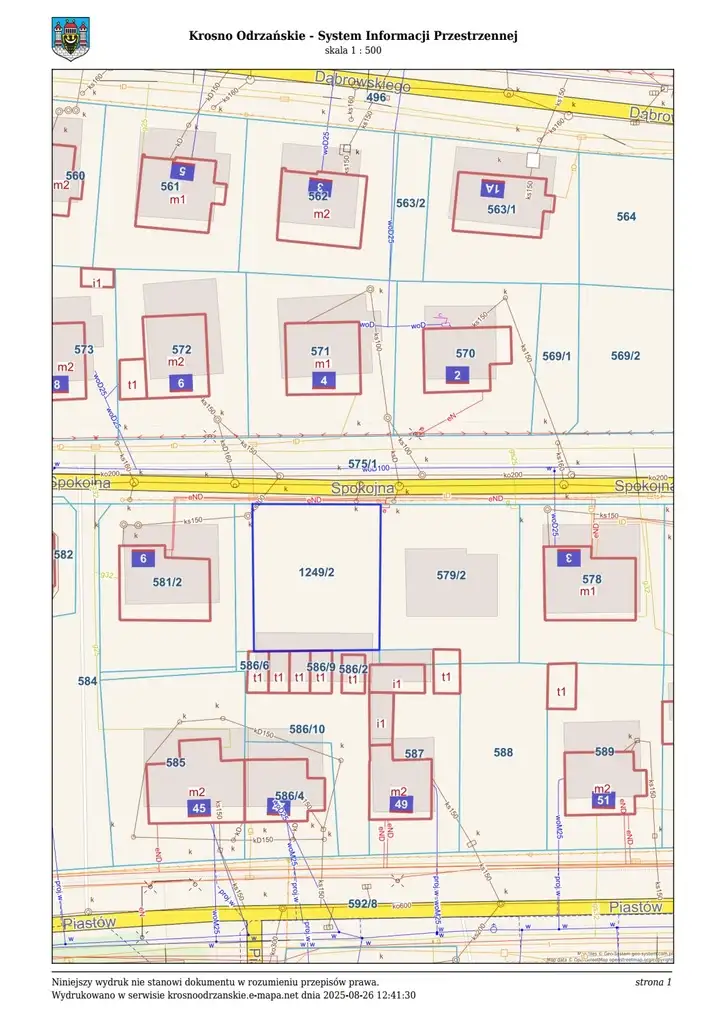 Nieruchomość gruntowa niezabudowana oznaczona działką nr 1249/2 o powierzchni 0,0390 położna w obrębie 0001 miejscowości Krosno Odrzańskie. Działka o regularnym kształcie zbliżonym do prostokąta. Rzeźba terenu o umiarkowanych zróżnicowaniach, obszar pofałdowany. Teren porośnięty trawą, krzewami, oraz pojedynczymi drzewami liściastymi i owocowymi. Obszar działki częściowo ogrodzony. Ogrodzenie z siatki stalowej w złym stanie technicznym. Nieruchomość frontową granicą przylega do drogi publicznej – ul. Spokojnej. Nieruchomość nie jest uzbrojona. Przez północno-zachodni narożnik działki przebiega przyłącze do sieci kanalizacyjnej (obecnie deszczowej) prowadzące do budynku mieszkalnego nr 9.
