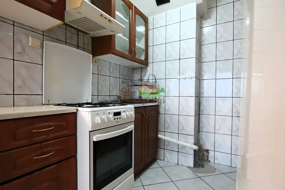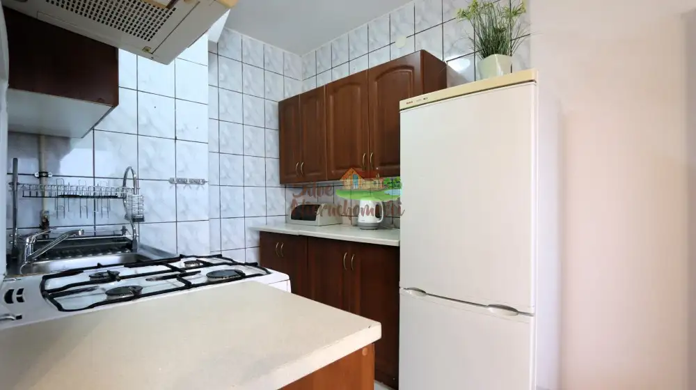 Kuchnia w formie otwartej jest połączona z salonem i wyposażona w meble kuchenne, zlewozmywak, piekarnik elektryczny, płytę gazową oraz lodówko-zamrażarkę. Duże okno o zachodniej ekspozycji zapewnia dostęp do mnóstwa naturalnego światła w godzinach południowych. Widok z 7. piętra na okolicę jest atrakcyjny i umożliwia podziwianie pejzażu miasta. Okna PCV z roletkami dodają funkcjonalności i komfortu.