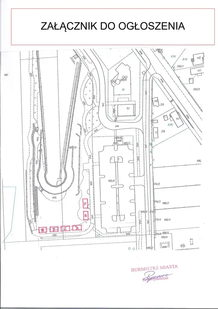 ogłasza ustny przetarg nieograniczony na oddanie w dzierżawę na 3 miesiące miejsc gastronomiczno – handlowych usytuowanych na nieruchomości oznaczonej w ewidencji gruntów m. Międzyrzec Podlaski w obrębie 4 numerem 484 i 485/10 o pow. 11 960 m² położonej przy ul. Zahajkowskiej, będącej własnością Gminy Miejskiej Międzyrzec Podlaski w zarządzie trwałym jednostki organizacyjnej - Miejskiego Ośrodka Sportu i Rekreacji w Międzyrzecu, miejsc o wielkości 20 m² każde. Położenie poszczególnych stanowisk z przeznaczeniem na prowadzenie działalności gastronomiczno – handlowej oznaczone zostało linią koloru czerwonego oraz oznaczeniem literowym A, B, C, D, E i F na mapie stanowiącej załącznik nr 1 do niniejszego ogłoszenia.