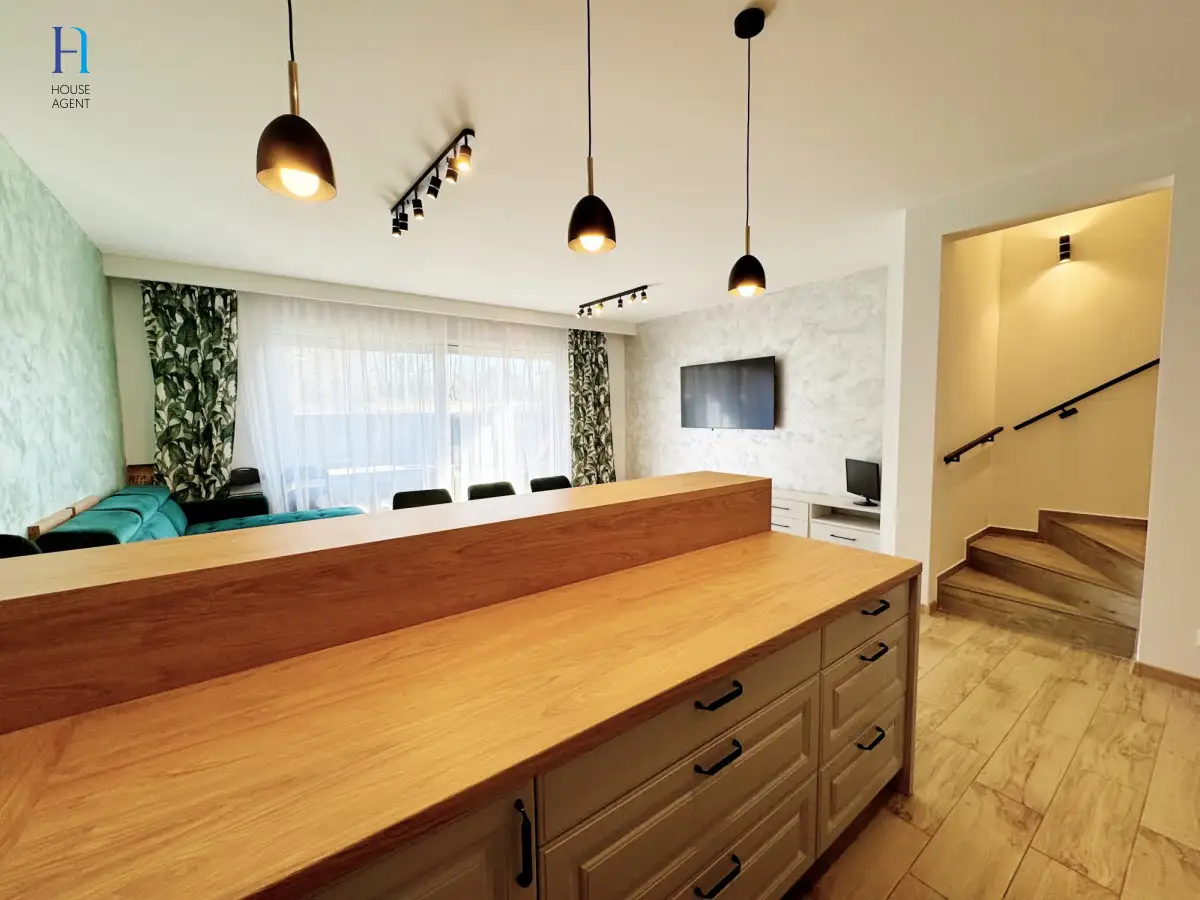 Na parterze znajdziesz przestronny salon z aneksem kuchennym, łazienkę z prysznicem oraz garaż.