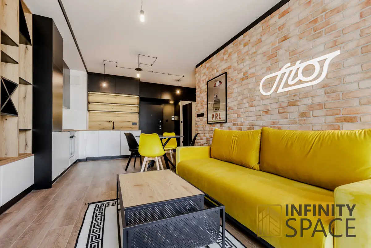 Flat:The two-room flat has an area of 45,1 m² and is located on the 1st floor of a 4-storey building. The flat is designed by an architect with priority for living comfort, fully finished with attention to detail using high quality materials and equipped with all necessary appliances and white goods (oven, hob, hood, dishwasher, fridge-freezer, washing machine) of quality brands. The flat has an exposure to the south-west. This guarantees proper daylighting of the rooms regardless of the season and comfortable conditions for relaxation. The flat is also high, which gives a sense of space.