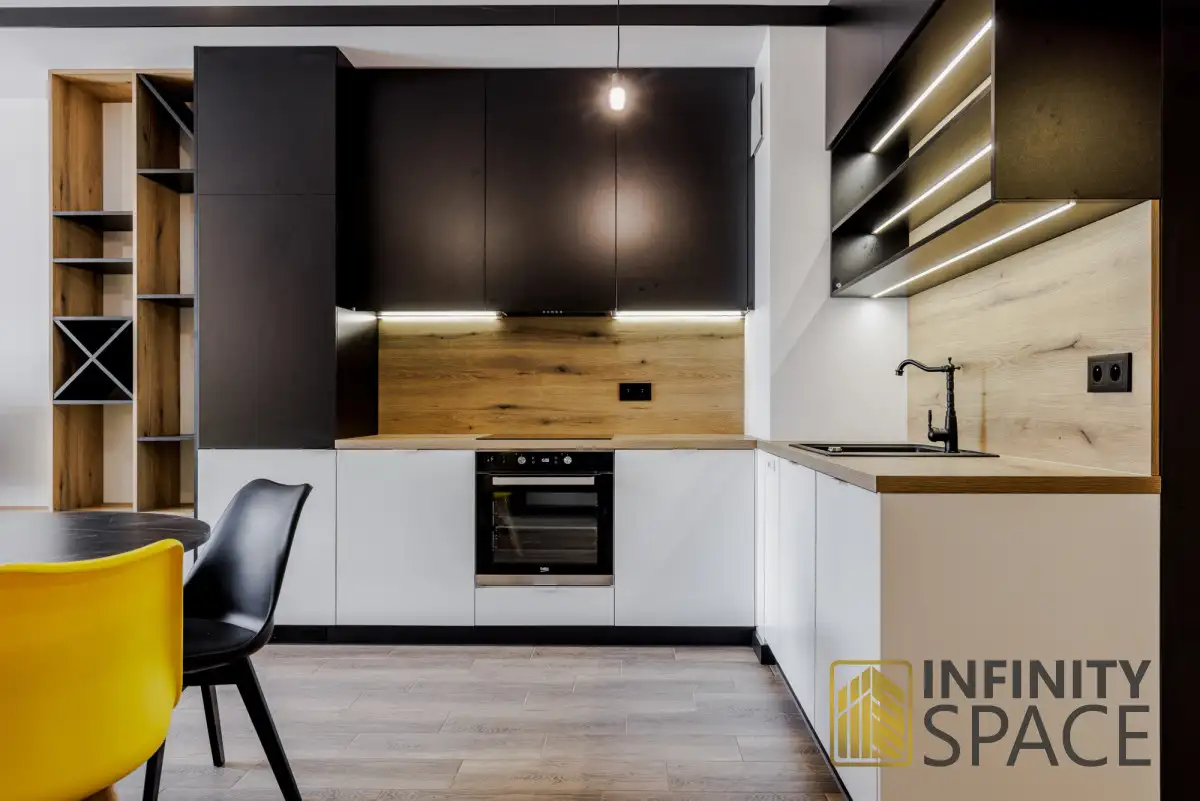 - open kitchen - equipped with all necessary kitchen appliances, with a large worktop and table,