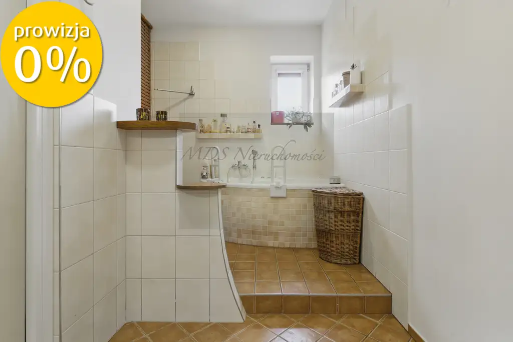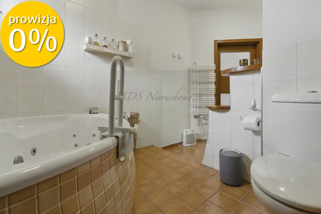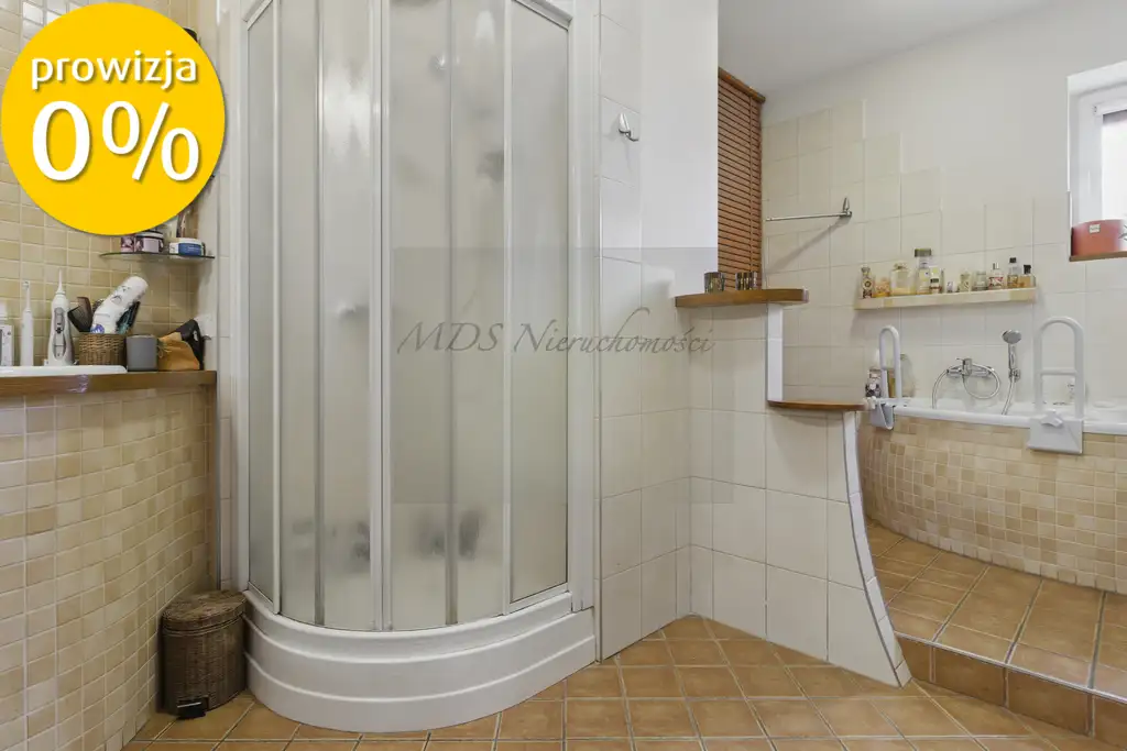 Łazienka o powierzchni 9 m² jest domowym spa, z narożną wanną z hydromasażem, kabiną prysznicową oraz umywalką z toaletką. Znalazł się w niej także schowek na pralkę i suszarkę ukryte za roletą.