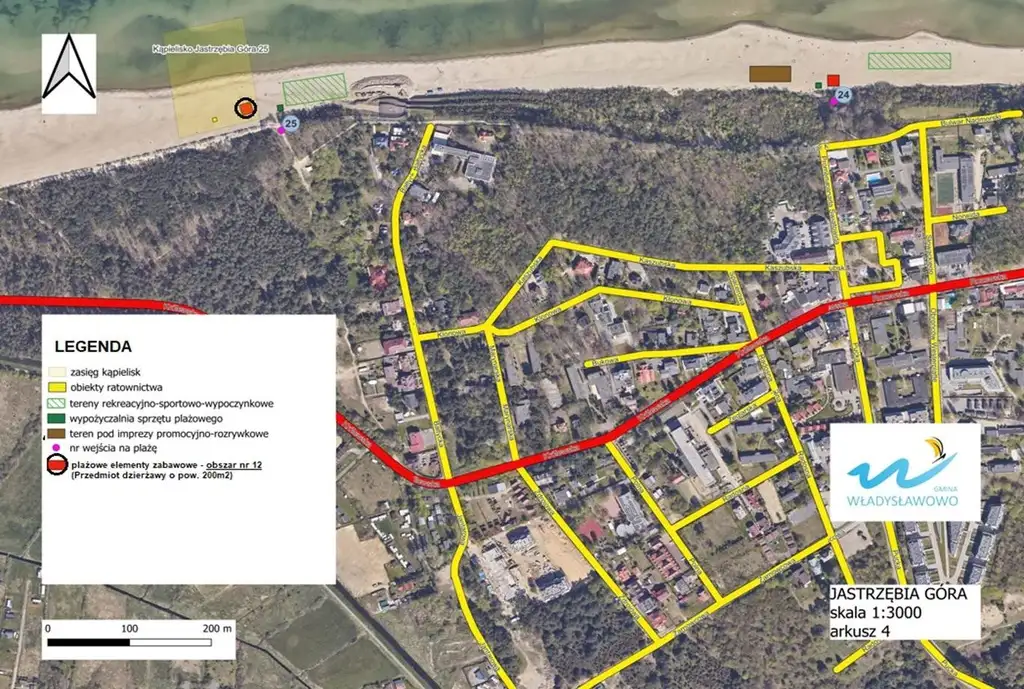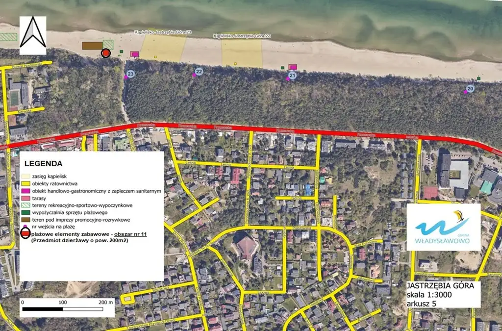 1. Część nieruchomości oznaczona nr 1/1 o powierzchni 5,3119ha położona w Jastrzębiej Górze, obręb ewidencyjny Jastrzębia Góra 08, opisana jako obszar nr 11 o powierzchni 200m², zlokalizowana po zachodniej stronie wejścia na plażę Jastrzębia Góra nr 23.