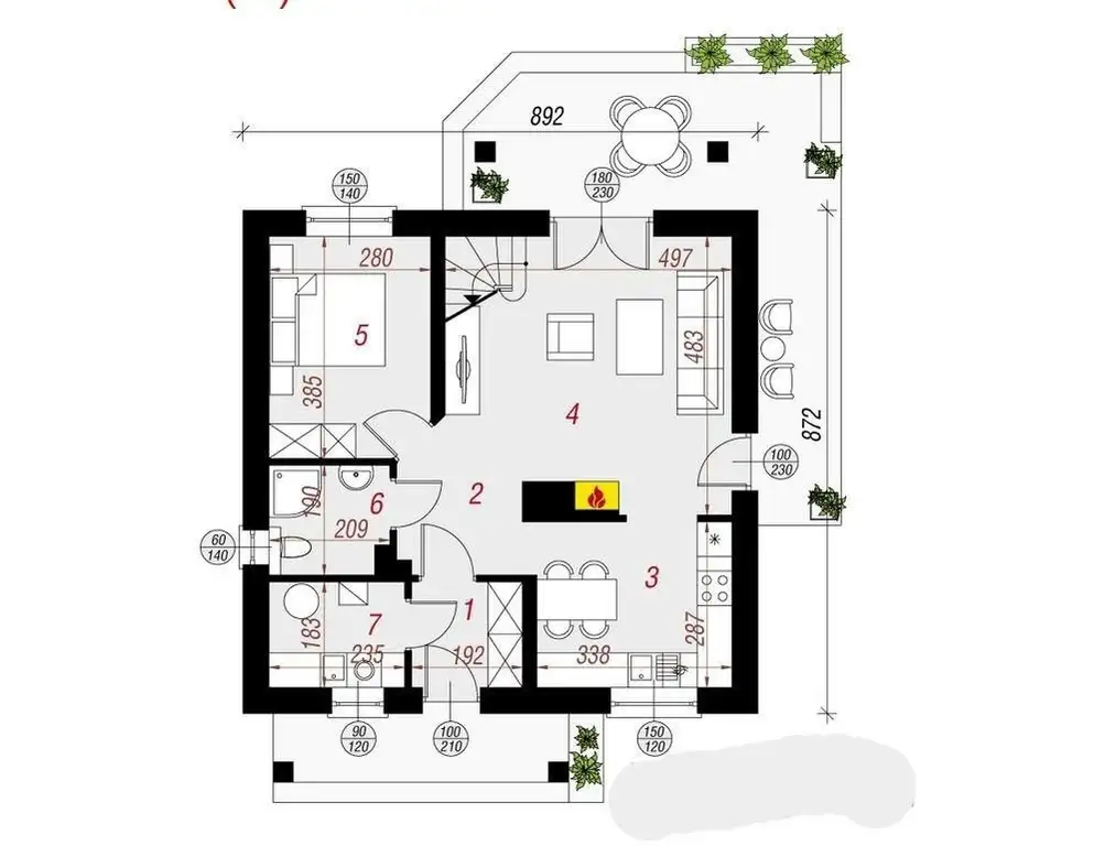 Prosta i tradycyjna bryła, przestronne, jasne wnętrza, salon z kominkiem i tarasem.