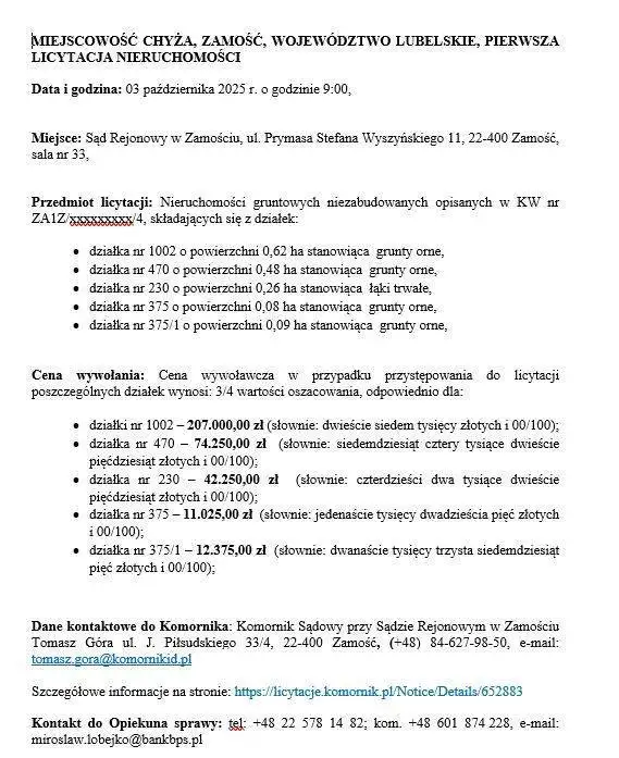MIEJSCOWOŚĆ CHYŻA, ZAMOŚĆ, WOJEWÓDZTWO LUBELSKIE, PIERWSZA LICYTACJA NIERUCHOMOŚCI