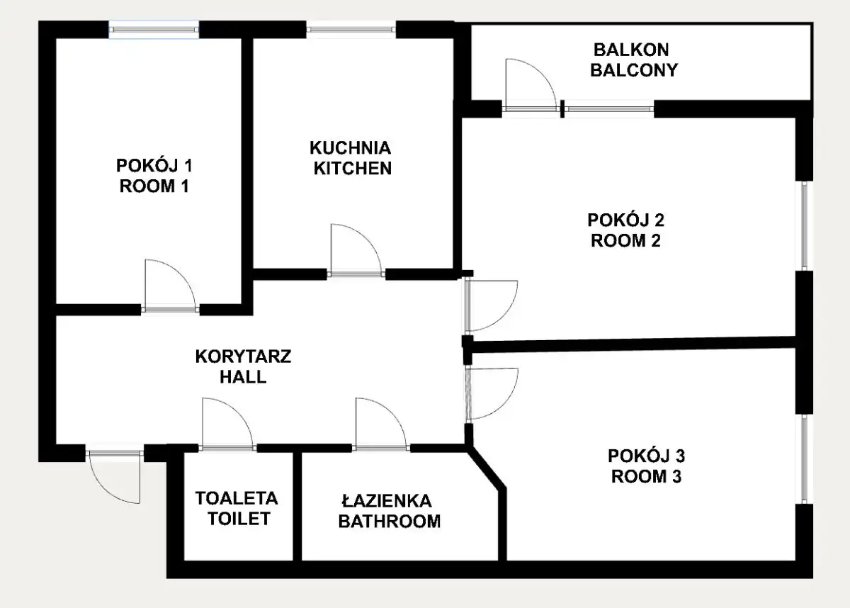 Pokoje: 3 Sypialnie - Pokoje, zamknięta kuchnia, przedpokój, łazienka, toaleta
