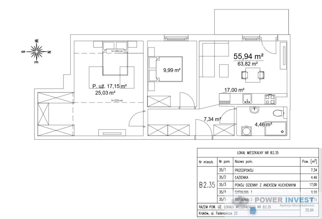 Mieszkanie znajduje się na 2 piętrze. Lokal ma powierzchnię 55,94 m powierzchni użytkowej (63,82 m² powierzchni po podłodze) i składa się z: