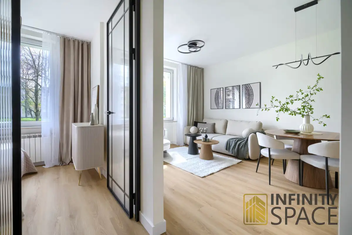 - ponad 37 m², 2 pokoje z oddzielną garderobą (salon z aneksem + sypialnia),