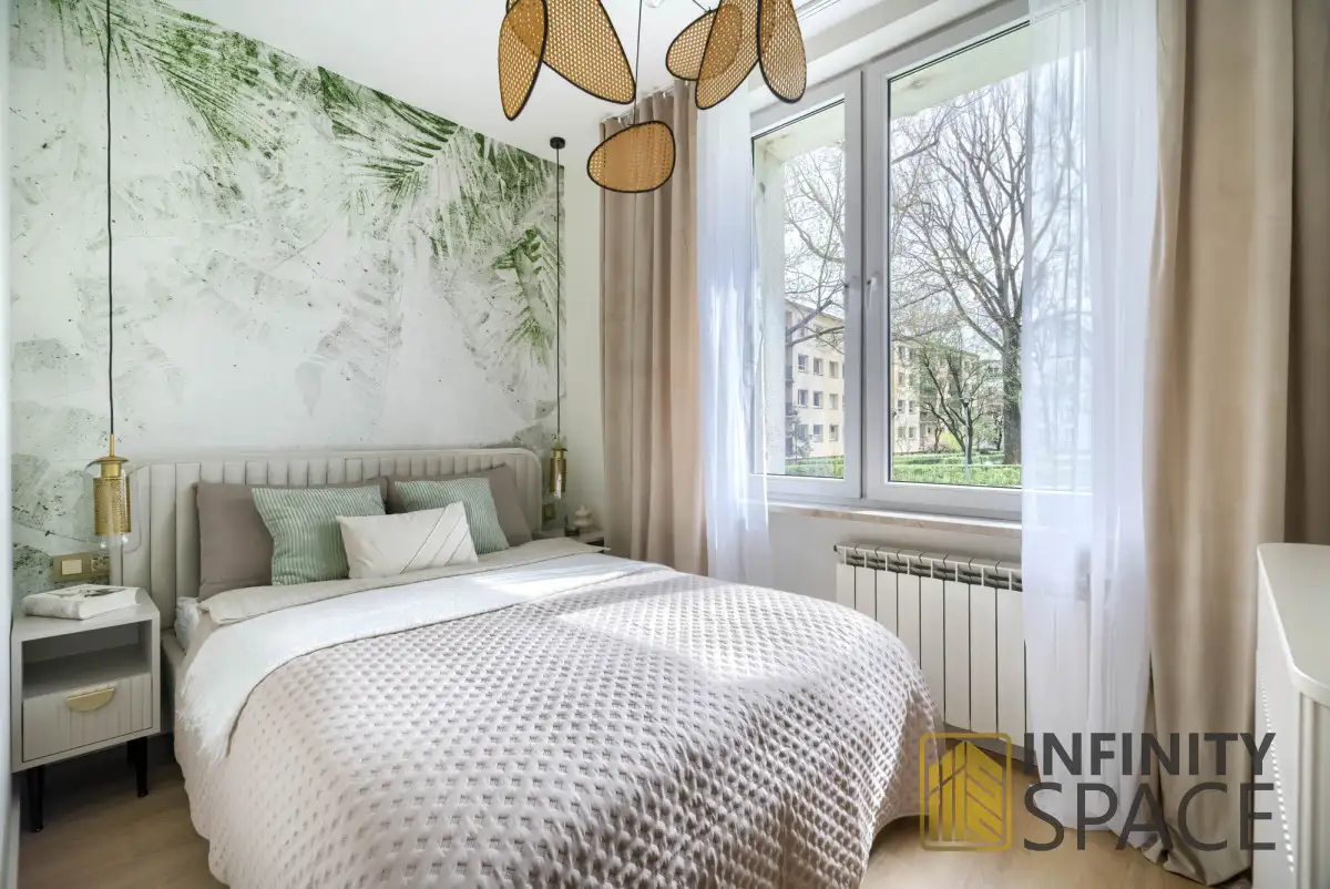 - sypialni z oryginalnym muralem z miejscem na wygodne łóżko o szerokości 140 cm. Do sypialni prowadzą drzwi, z ornamentowego, hartowanego szkła o wysokości 240 cm.