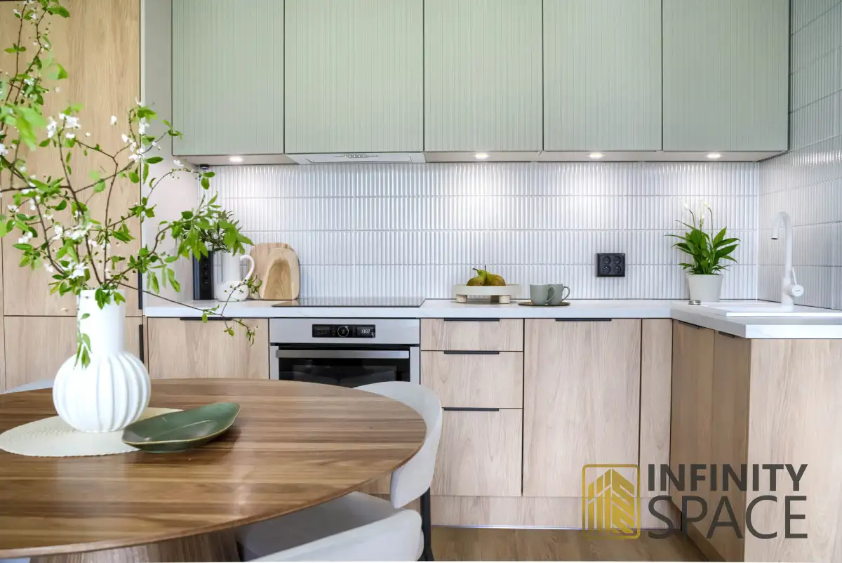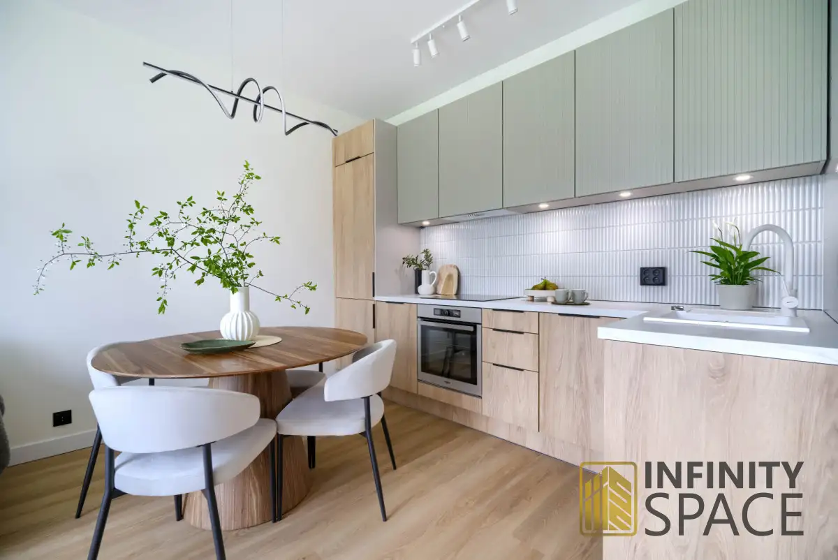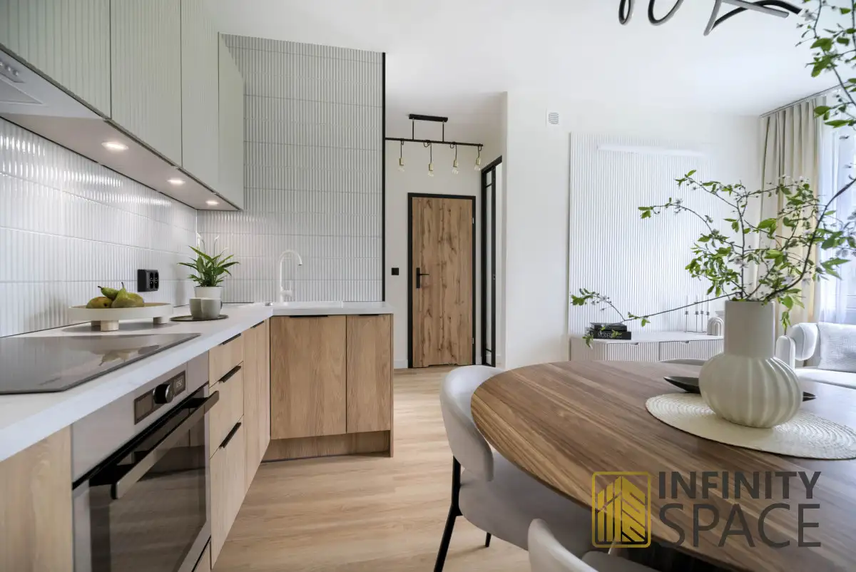 - aneksu kuchennego wykonanego z efektownymi ryflowanymi frontami w pełni wyposażonego w sprzęty AGD ,