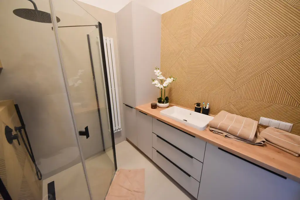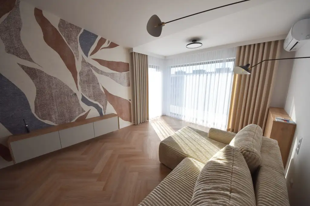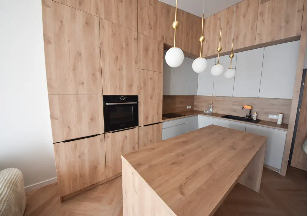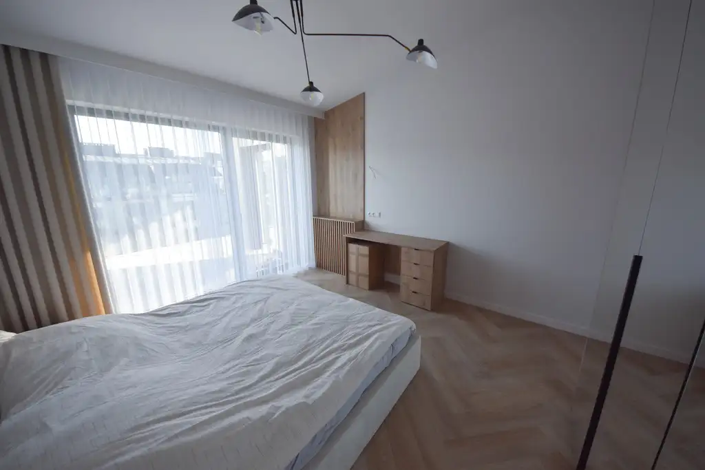 Całość urządzona została z dbałością o każdy detal - meble wykonane na wymiar z materiałów najwyższej jakości nadają wnętrz nowoczesny, elegancki charakter.Funkcjonalna w pełni wyposażona kuchania na zamówienie, gotowa do codziennego użytku, duża wyspa kychenna salon z klimatyzacją - przestronny jasny dzięki dużym oknom, duże szafy w zabudowie, zapewniające dużo miejsca do przechowywania,słoneczny przestronny taras - idealny na poranną kawę, lub wieczorny relaks ( wystarczy,że dokupisz meble ogrodowe) pralka i suszarka do ubrań - dla pełnej wygody najemcy. Pokój sypialniany z dużym łóżkiem i szafą w zabudowie