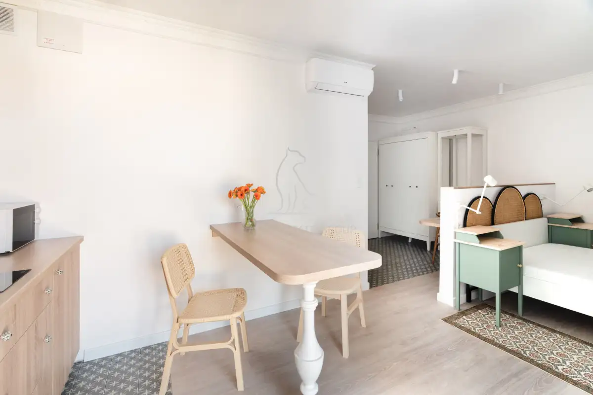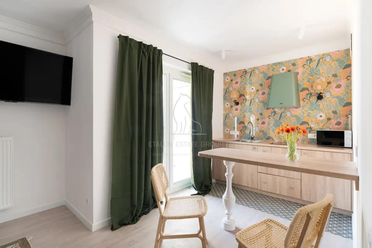 - Aneks kuchenny z pełnym wyposażeniem (zmywarka, mikrofalia, płyta indukcyjna, lodówka) +stół i dwa krzesła.