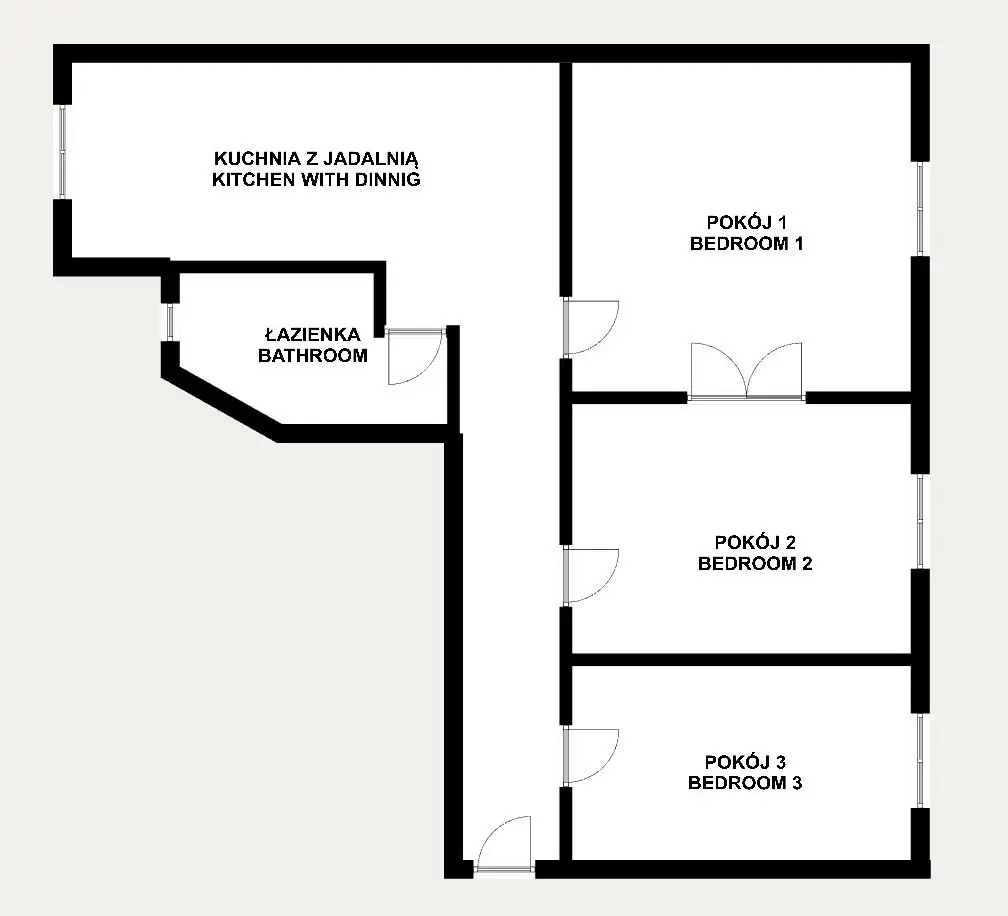 Pokoje: Przedsionek, kuchnią z jadalnią, trzy pokoje sypialniane (duży, średni, mały)