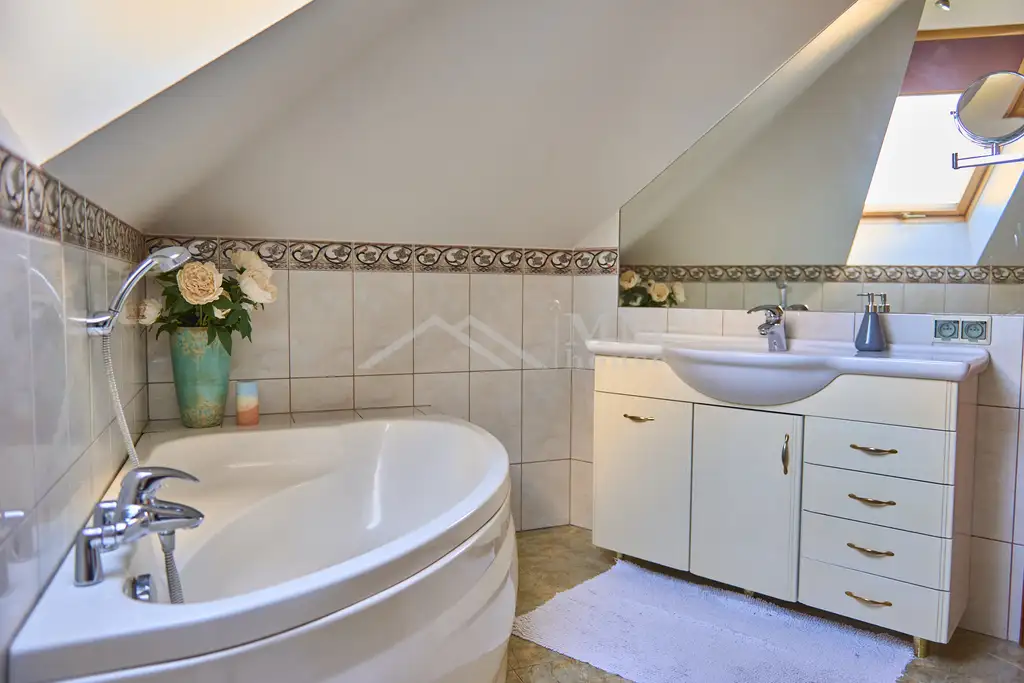 Druga działka mieści pomieszczenia gospodarcze oraz przepiękny ogród – starannie zaaranżowany, z licznymi nasadzeniami, będący prawdziwym oczkiem w głowie obecnych właścicieli.