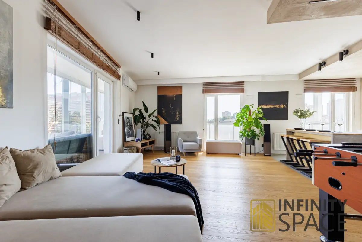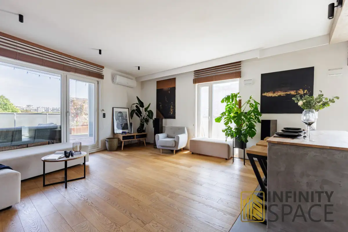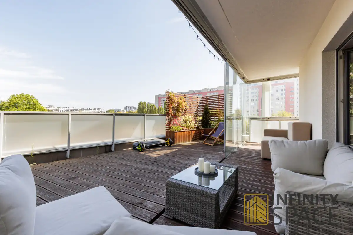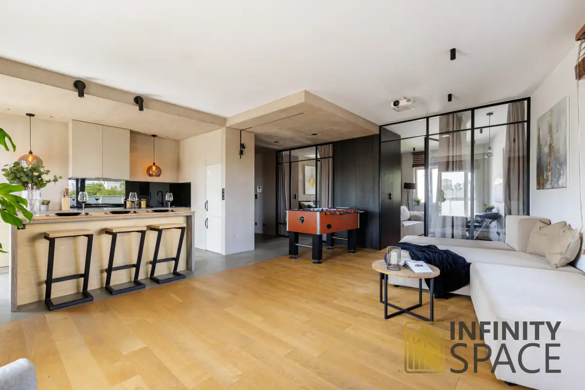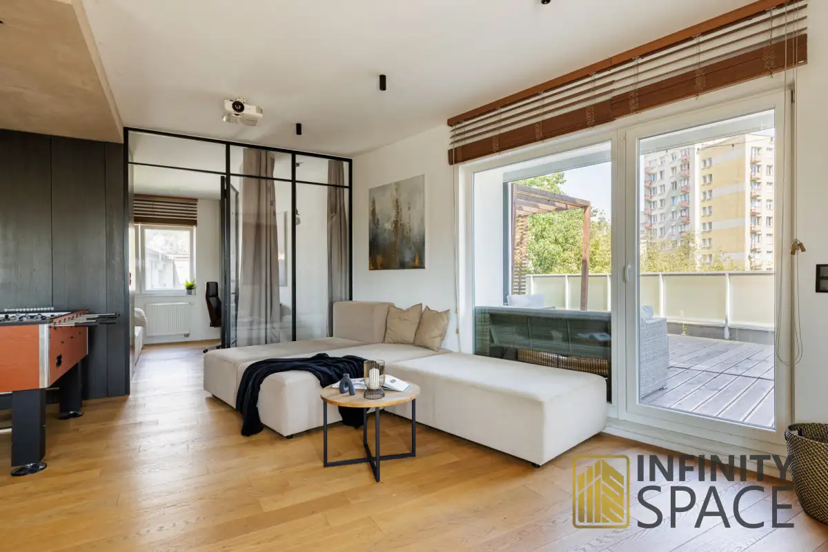 ----------------- ENGLISH ----------------LOFT APARTMENT 81 m² | SASKA KĘPA | UNDERGROUND GARAGE x2 | AIR CONDITIONING | TERRACE 65 m²APARTMENTA comfortable, spacious, modern, and fully equipped PREMIUM apartment in the “Dom Saski” development, with an area of 81 m², located on the top third floor of an intimate three-story building with an elevator. The east-south exposure and large, bright windows guarantee good lighting. The apartment was designed by an interior designer and finished to a high standard, with custom-made woodwork made from the highest quality materials. The premises are very quiet. The apartment is equipped with high-end household appliances. It has an extremely functional layout, air conditioning, and an electric projection screen.