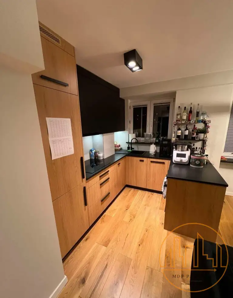 Salon z aneksem kuchennym - kuchnia wykonana na wymiar, wyposażona w sprzęt AGD (lodówka, piekarnik, płyta indukcyjna, zmywarka, pochłaniacz oraz pralka). Blaty kuchenne z czarnego granitu satynowanego. W salonie nowa sofa z funkcją spania.
