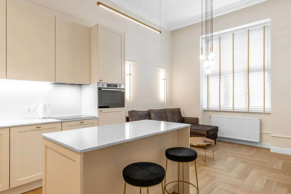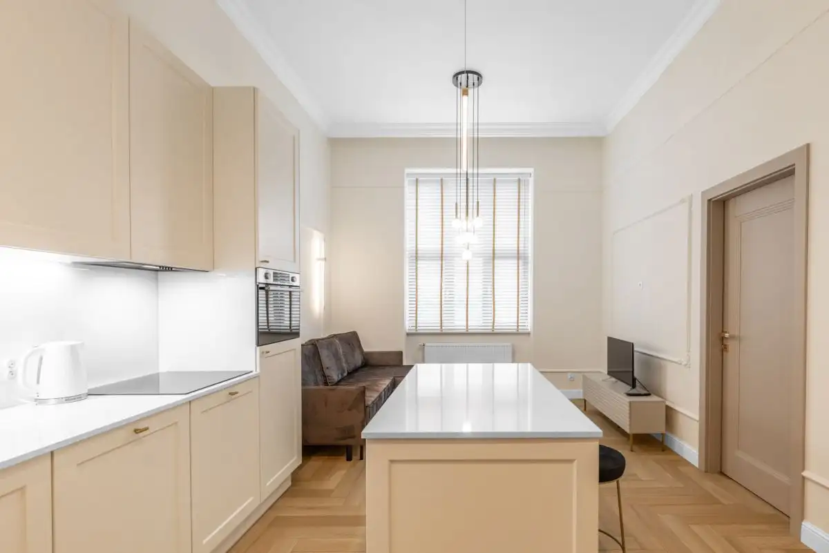 - jasny, nowoczesny pokój dzienny z aneksem kuchennym