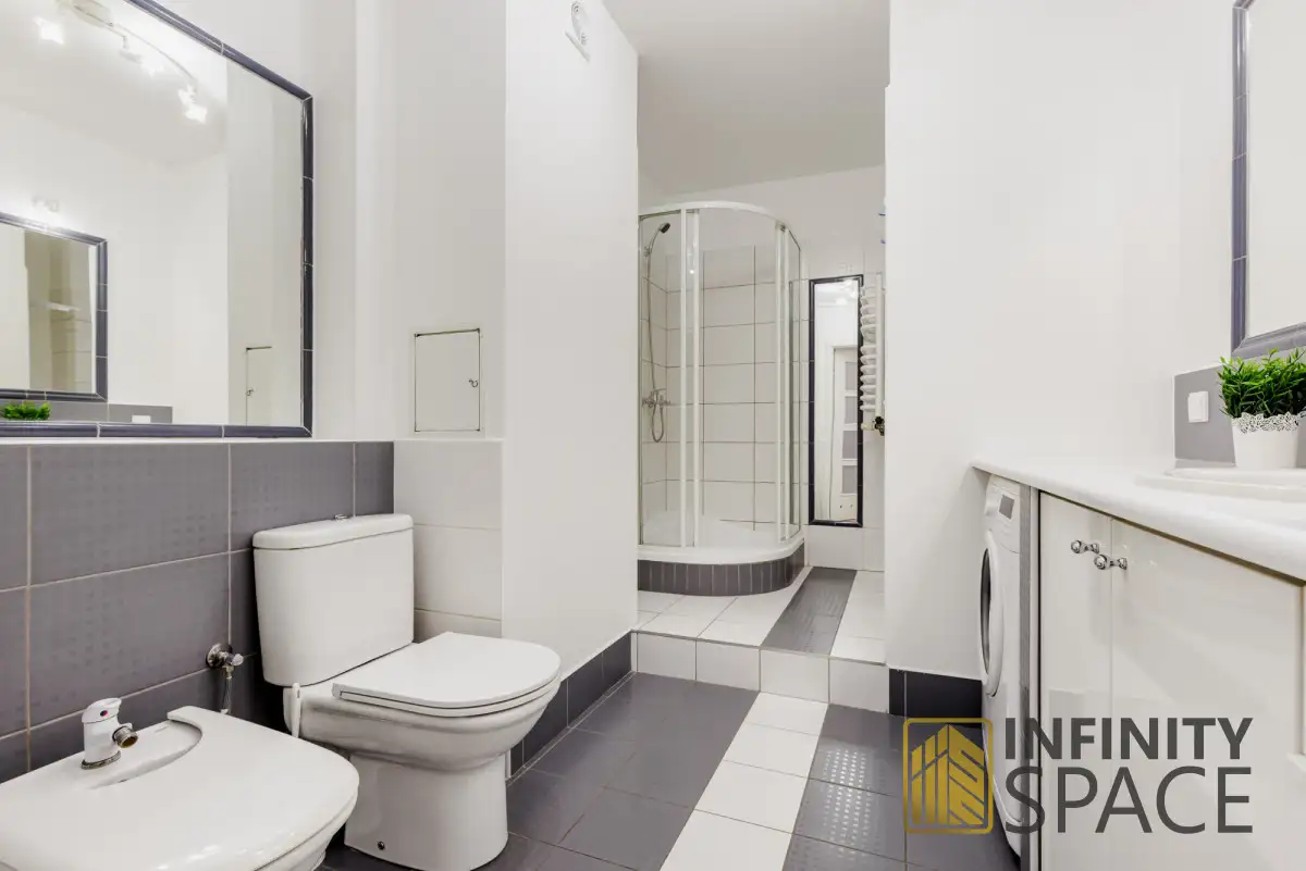 - przestrzennej łazienki z kabiną prysznicową, WC, bidetem, umywalką i pralką,