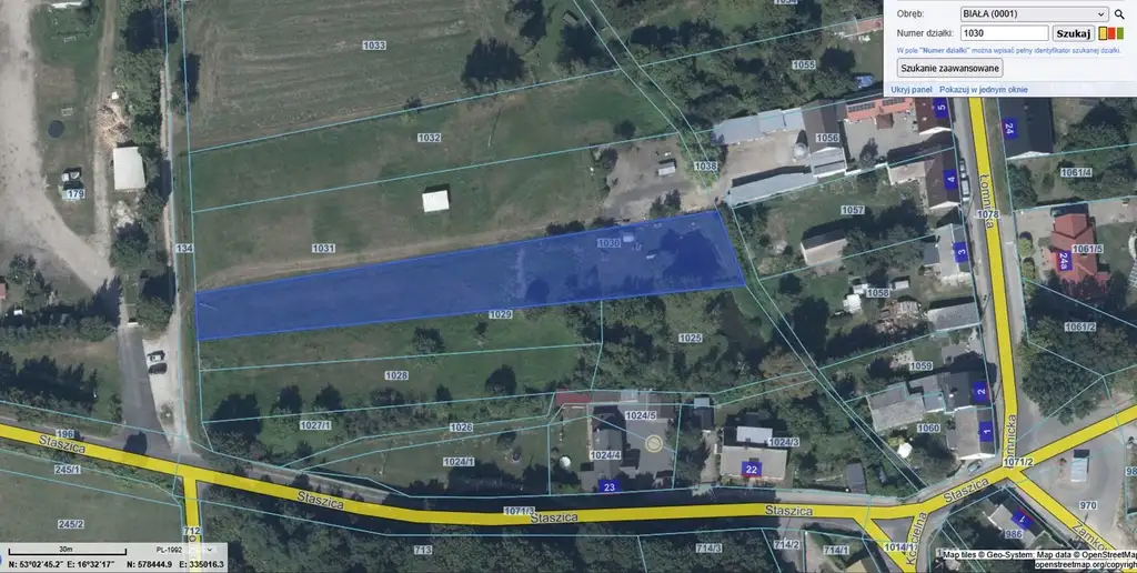 Nieruchomość gruntowa położona jest na terenie zurbanizowanym, w sąsiedztwie pojedynczej zabudowy mieszkaniowej i usługowej oraz terenów niezabudowanych. Teren działki równy, kształt działki średnio korzystny. Dostęp do działki drogą asfaltową (ok. 30 m drogą utwardzoną). Nad częścią rolniczą działki przebiega linia energetyczna średniego napięcia o szerokości pasa oddziaływania 14,00 m. Zgodnie z miejscowym planem zagospodarowania przestrzennego gminy Trzcianka na obszarze wsi Biała, zatwierdzonym uchwałą Nr XXXVII/379/21 Rady Miejskiej Trzcianki z dnia 18 maja 2021 r., przeznaczona jest pod teren zabudowy mieszkaniowej jednorodzinnej oraz pod tereny rolnicze. Nieruchomość podlega opodatkowaniu VAT 23%. Dział III i IV KW PO1T/00009853/4 nie wykazują żadnych obciążeń dot. ww. nieruchomości.