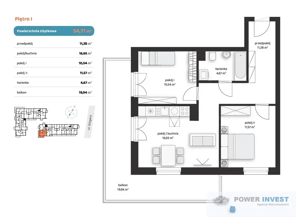Mieszkanie znajduje się na I piętrze, ma powierzchnię 54,71 m² i składa się z: