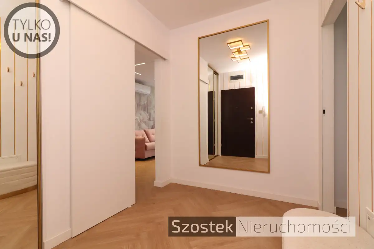 Mieszkanie przeszło w tamtym roku generalny remont obejmujący nowe podłogi w pokojach, kuchni i holu (wodoodporne panele winylowe), a w łazience: płytki ceramiczne wielkoformatowe Max-Fliz. Nowa łazienka wyposażona w wykonaną na zamówienie podwójną umywalkę z płytek tego samego rodzaju, których użyto do wykończenia całości. Ponadto kabina prysznicowa Excellent z odpływem liniowym oraz armaturą podtynkową, zestaw podtynkowy Grohe, szafki wykonane na wymiar, a także pralko-suszarka Haier. Nowa kuchnia wykonana na wymiar wraz z nowoczesnymi sprzętami AGD takimi jak płyta indukcyjna Electrolux, piekarnik dwuczęściowy Samsung, lodówka Samsung, zmywarka Whirlpool 60cm, mikrofalówka Candy, okap. Podczas remontu zainstalowano również klimatyzację firmy Gree. W przedpokoju znajduje się szafa w zabudowie z lustrem oraz lustro i puf ze schowkiem. Sypialnia wyposażona w dużą szafę na wymiar, mniejszą szafę w zabudowie oraz szafki wiszące (pozostałe wyposażenia takie jak rozkładane łóżko lub biurko - do uzgodnienia). W salonie kanapa rozkładana Max-Fliz, pojemna szafa IKEA, stół jadalniany, 4 krzesła, Telewizor Smart TV LG 2024. Całości dopełniają wysokiej klasy drewniane i lakierowane drzwi bezprzylgowe firmy Inter Door, oświetlenie liniowe LED wpuszczane w sufit i inne nowoczesne rozwiązania oświetleniowe (np. regulowane natężenie światła w przedpokoju), a także firany i zasłony marki Euro-Firany oraz tapeta Max-Fliz.