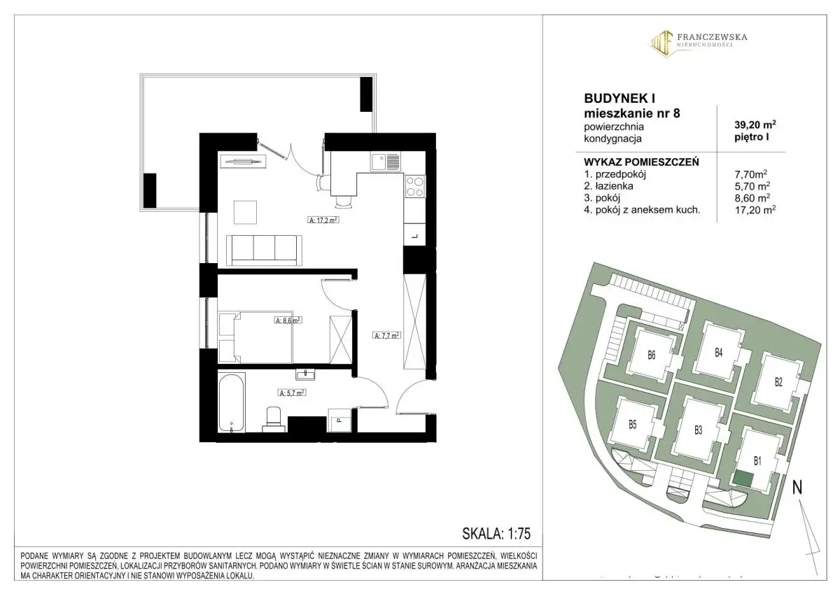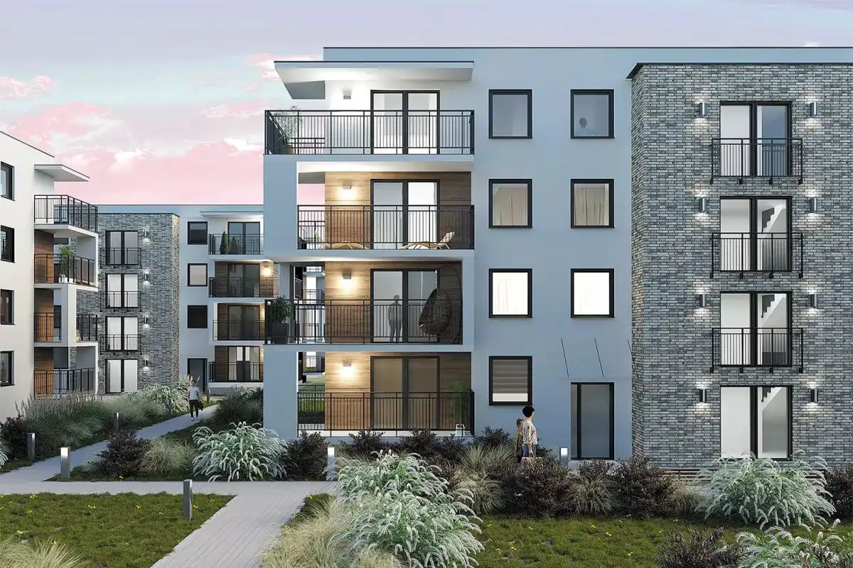 Dwupokojowe mieszkanie o powierzchni 39,20 m² na 1 piętrze w 3 piętrowym bloku.