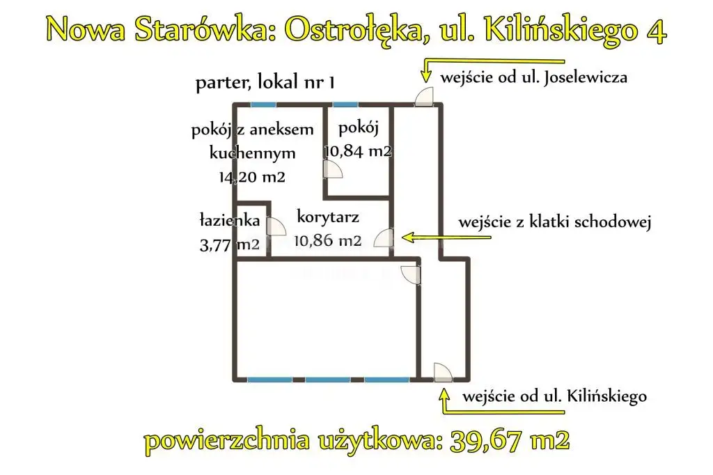 Układ pomieszczeń: korytarz: 10,86 m², łazienka: 3,77 m², pokój z aneksem kuchennym: 14,20 m² oraz pokój: 10,84 m².