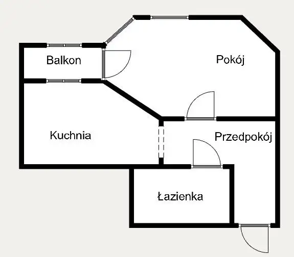 Pomieszczenia: pokój, kuchnia, przedpokój, łazienka, zabudowany balkon