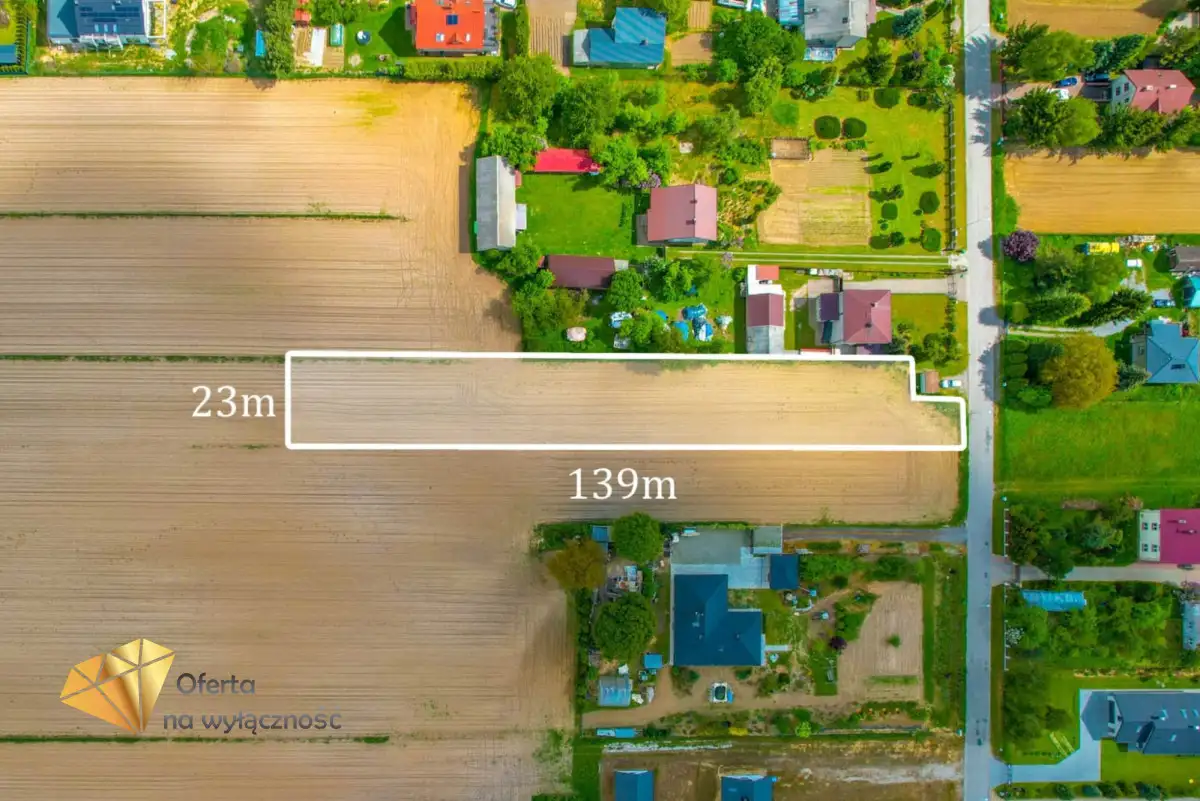 Działka o pow. 3000 m² w kształcie prostokąta o wymiarach 23mX 139 m usytuowana jest w pierwszej linii zabudowy bezpośrednio przy drodze asfaltowej o numerze 369/9