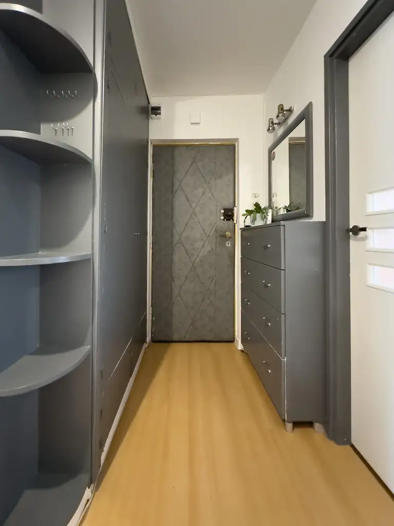 łazienka z prysznicem (ok. 3 m²),korytarz (ok. 5 m²),balkon,komórka lokatorska (ok. 2 m²).