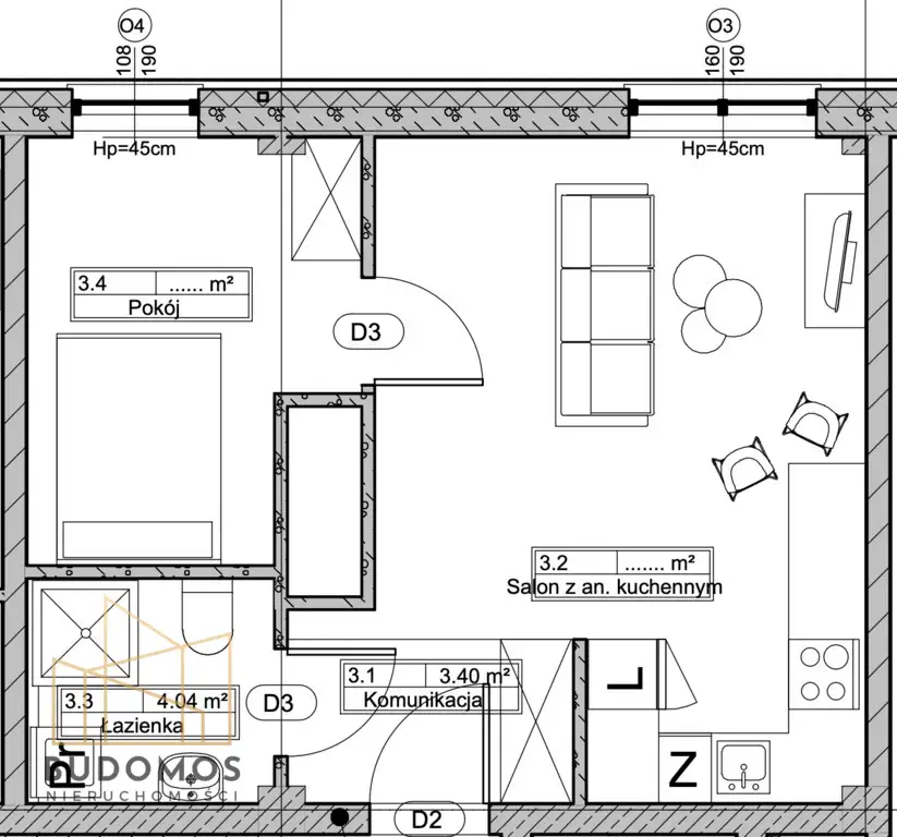 - salonu z aneksem kuchennym,