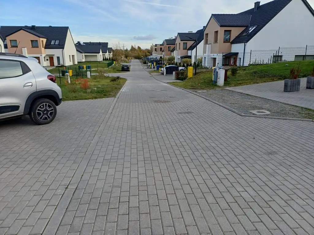 Działka, prócz frontu - ogrodzona siatką. Podjazd i taras z kostki betonowej.