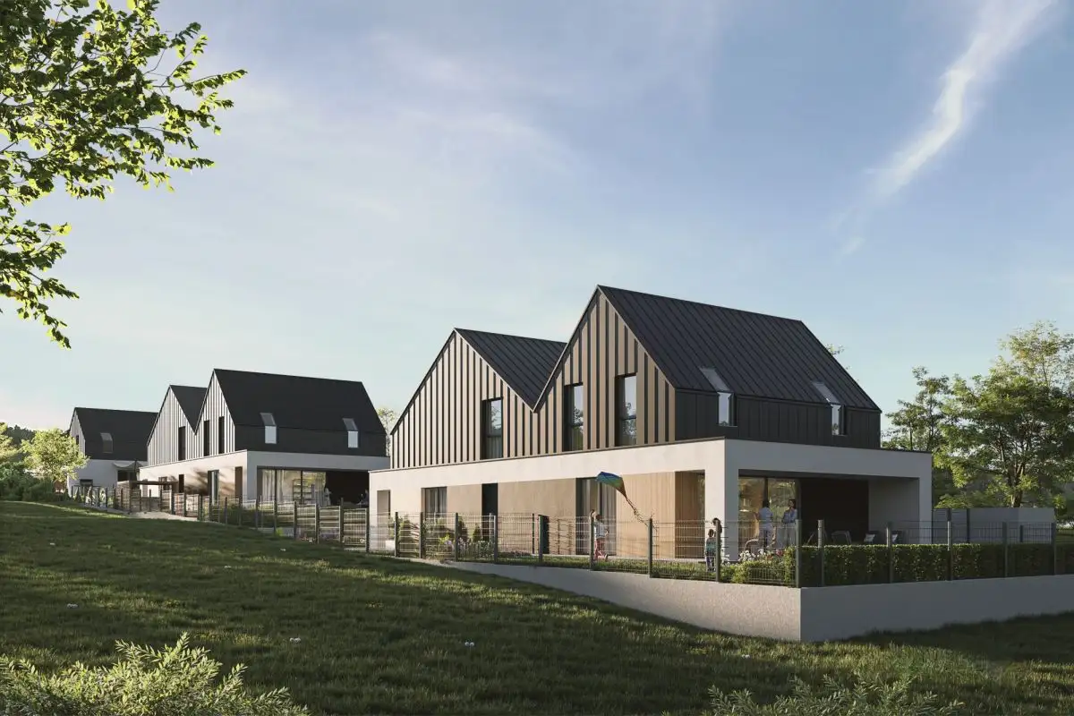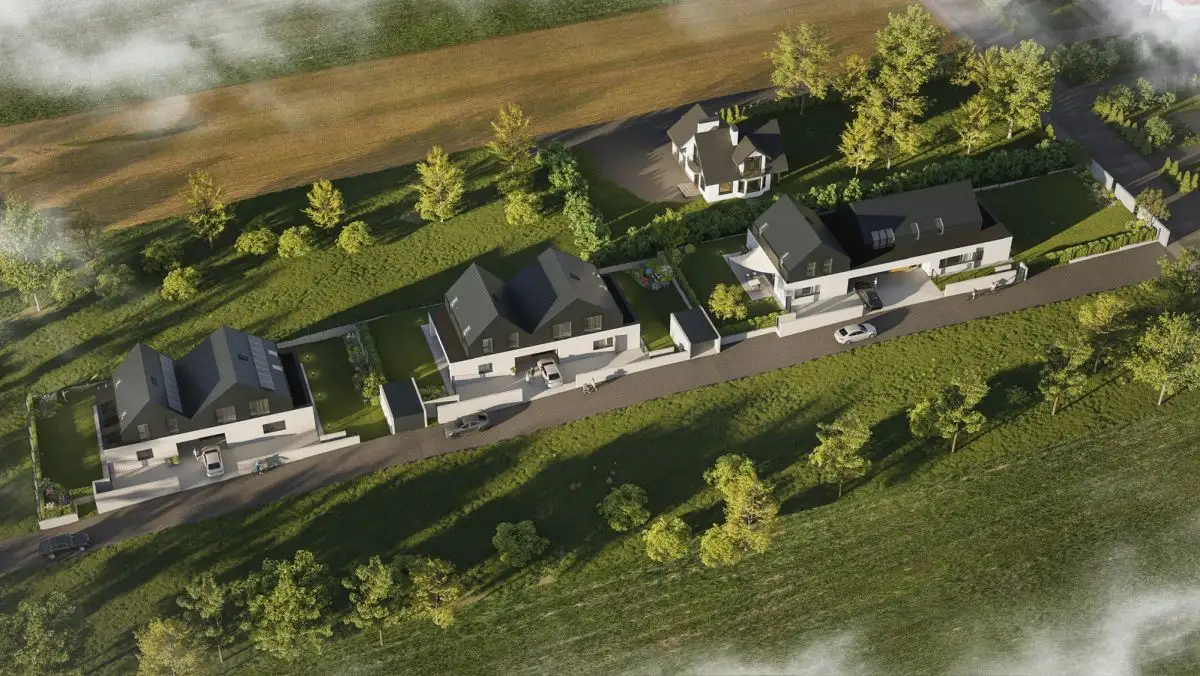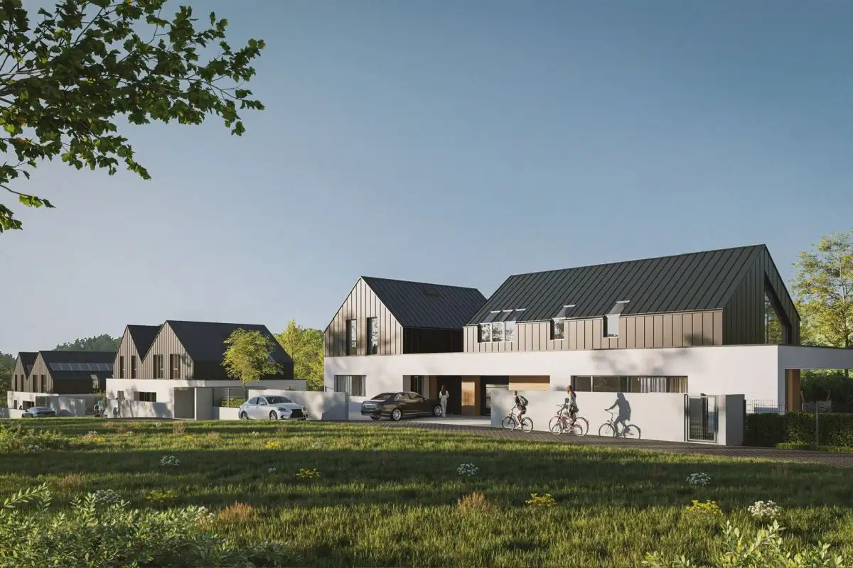 Nowoczesny dom w zabudowie bliźniaczej stanowiący część kameralnej inwestycji deweloperskiej na zielonych przedmieściach Lublina. Minimalistyczna i elegancka bryła przykuwa uwagę i doskonale wpisuje się w okoliczny krajobraz. Osiedle zapewnia wygodne połączenie komunikacyjne z miastem dzięki bliskości przystanku MPK.
