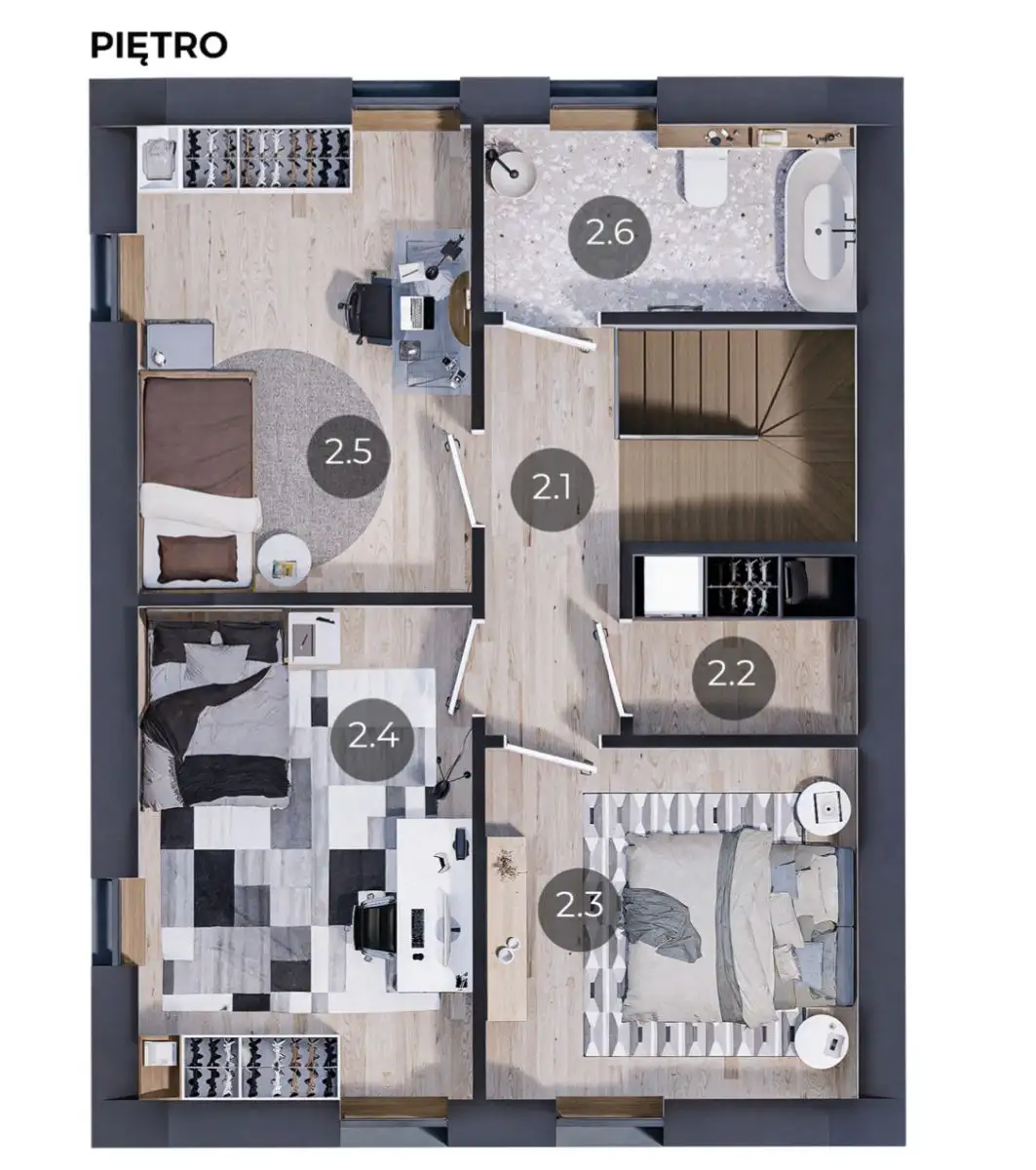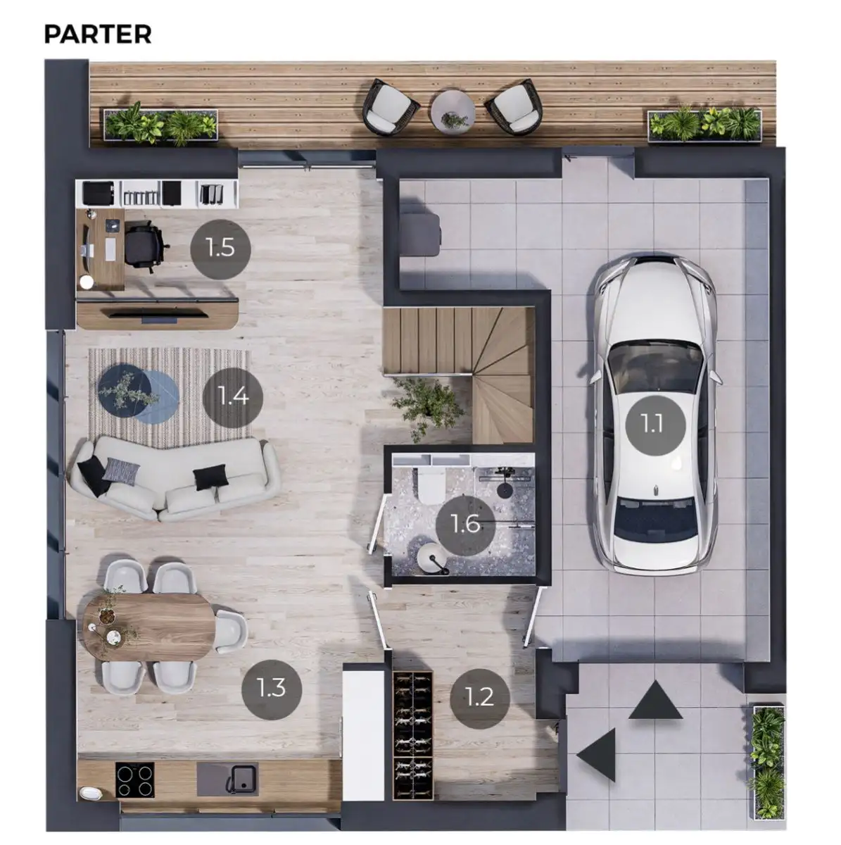 - parter: wiatrołap, salon z jadalnią i aneksem kuchennym, gabinet, łazienka